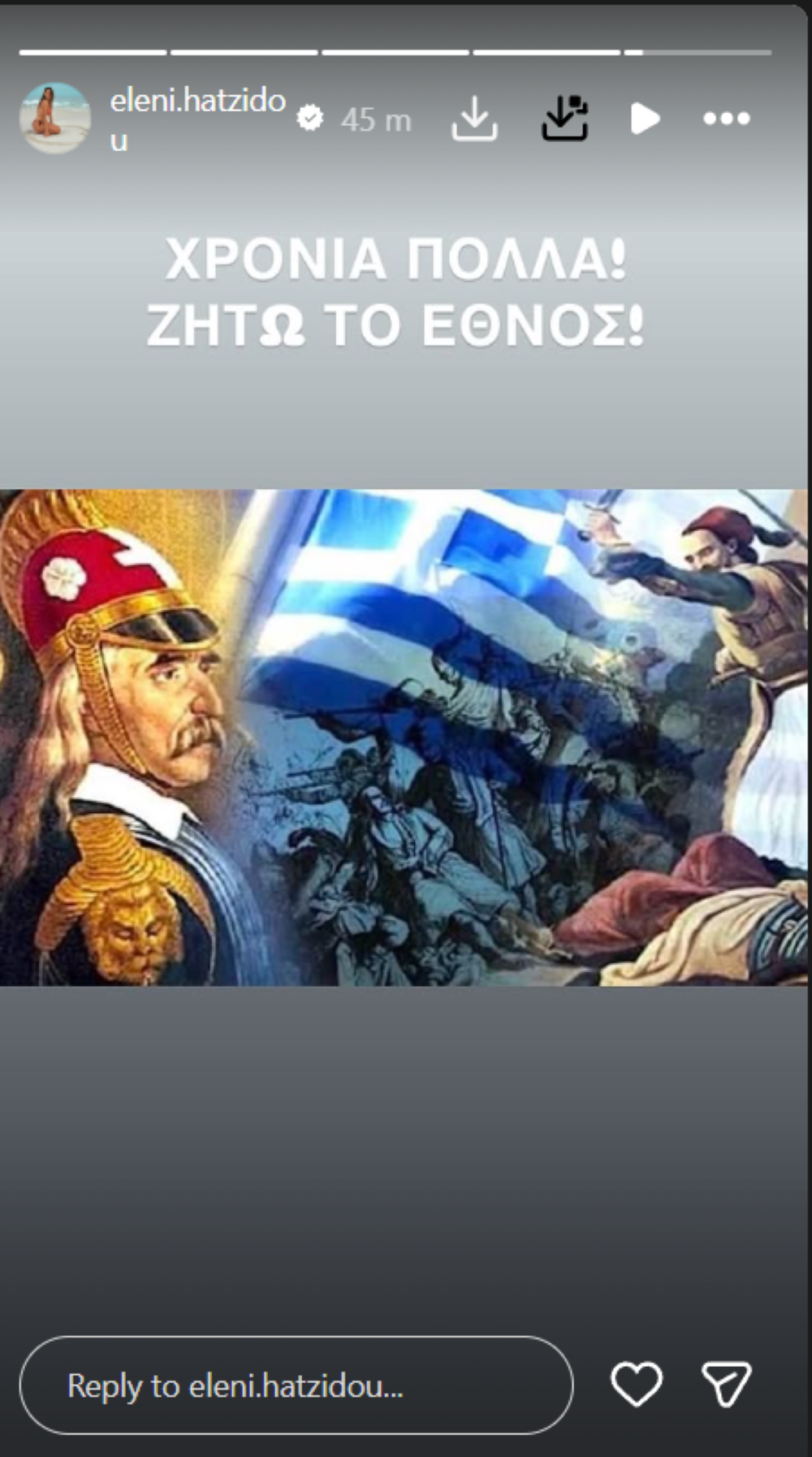 Ανάμεσα στις αναρτήσεις που ξεχώρισαν, ο Νίκος Κοκλώνης επέλεξε μια εικόνα με έντονο ιστορικό συμβολισμό, συνοδεύοντάς τη με τη φράση: «Χρόνια Πολλά Ελλάδα!».