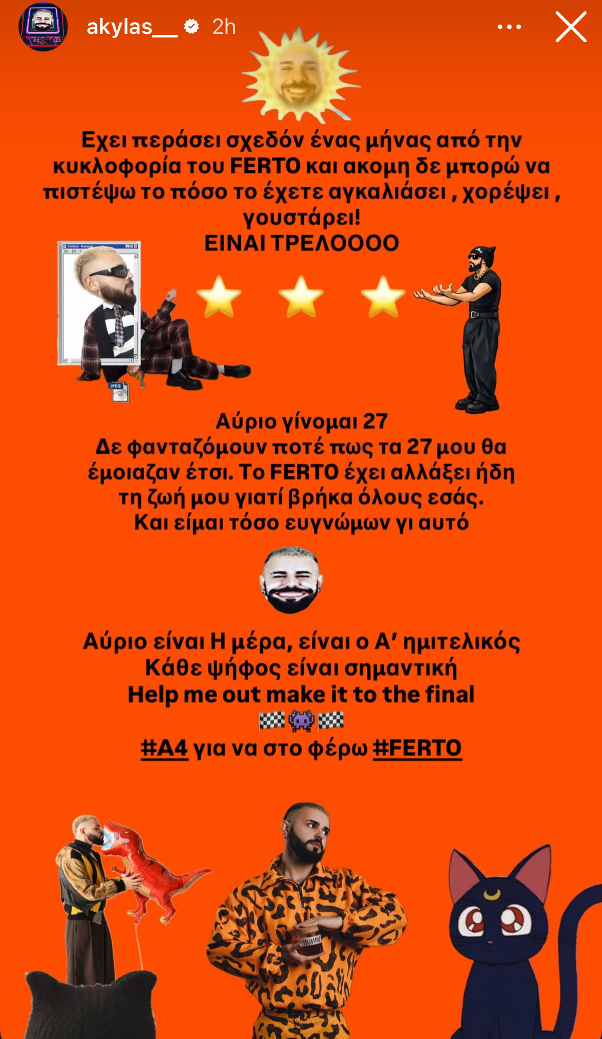 Λίγες ώρες πριν από τα γενέθλιά του, αλλά και πριν από τον Α’ ημιτελικό του εθνικού τελικού για τη Eurovision, ο Akylas θέλησε να στείλει το δικό του μήνυμα μέσα από τον προσωπικό του λογαριασμό στο Instagram.