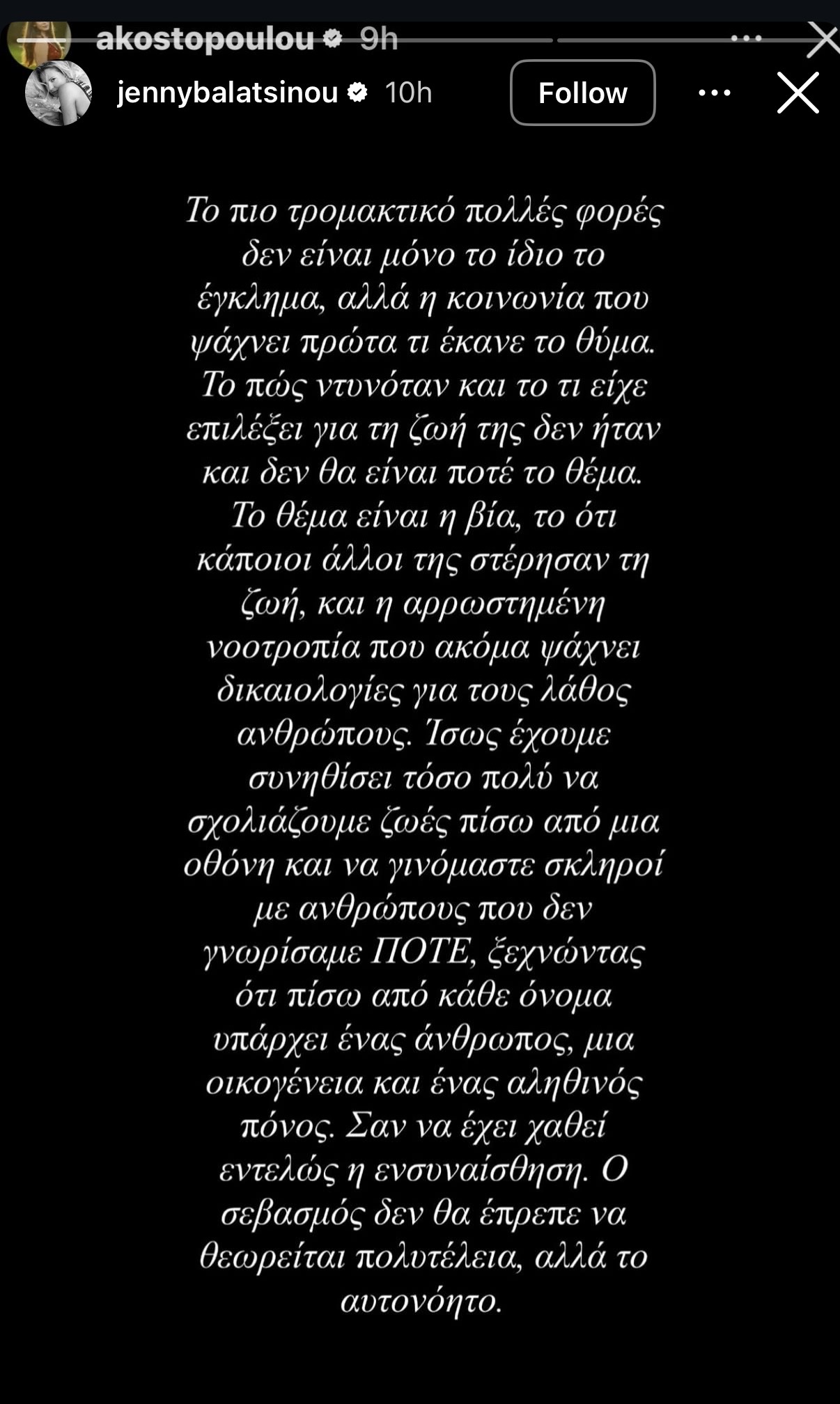 «Το πιο τρομακτικό πολλές φορές δεν είναι μόνο το ίδιο το έγκλημα αλλά η κοινωνία που ψάχνει πρώτα τι έκανε το θύμα. Το πώς ντυνόταν και το τι είχε επιλέξει για τη ζωή της δεν ήταν και δεν θα είναι ποτέ το θέμα. Το θέμα είναι η βία, το ότι κάποιοι άλλοι της στέρησαν τη ζωή και η αρρωστημένη νοοτροπία που ακόμα ψάχνει δικαιολογίες για τους λάθος ανθρώπους. Ίσως έχουμε συνηθίσει τόσο πολύ να σχολιάζουμε ζωές πίσω από μια οθόνη και να γινόμαστε σκληρή με ανθρώπους που δε γνωρίσαμε ποτέ, ξεχνώντας ότι πίσω από κάθε όνομα υπάρχει ένας άνθρωπος μία οικογένεια κι ένας αληθινός πόνος. Σαν να έχει χαθεί εντελώς η ενσυναίσθηση. Ο σεβασμός δε θα έπρεπε να θεωρείται πολυτέλεια αλλά το αυτονόητο».