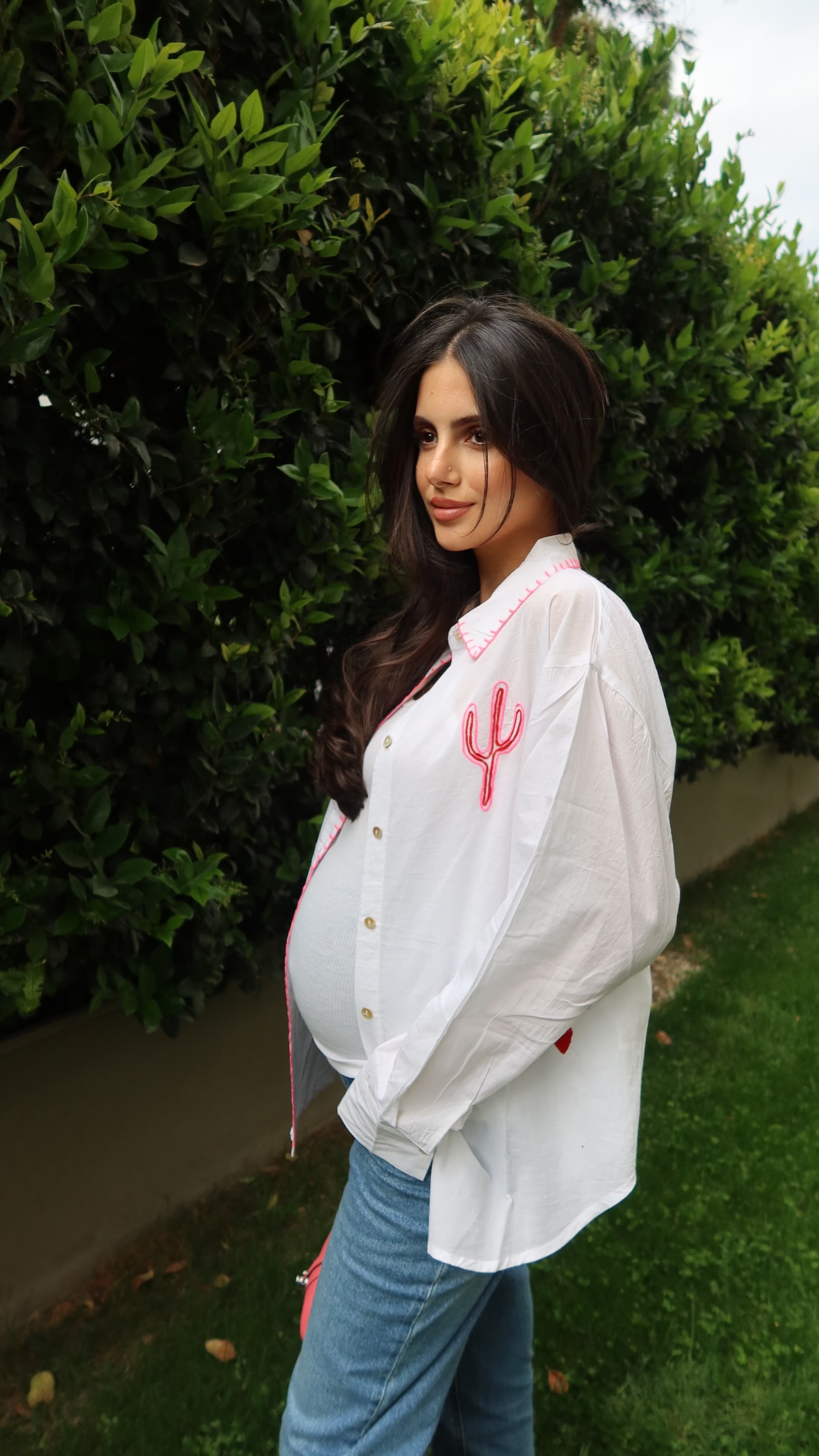 Στη φωτογραφία, εμφανίζεται χαμογελαστή, απολαμβάνοντας τον καλό καιρό, ενώ η φουσκωμένη κοιλιά της μαρτυρά το προχωρημένο στάδιο της εγκυμοσύνης της.