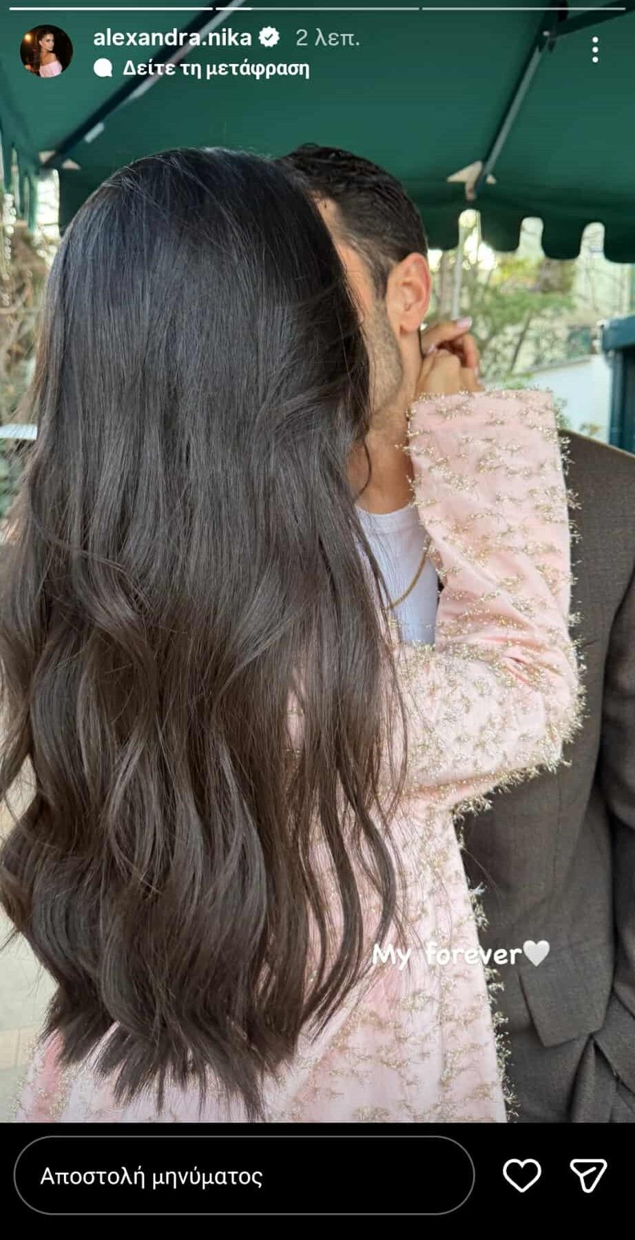 Στη δημοσίευση φαίνονται οι δύο τους αγκαλιασμένοι, με την Αλεξάνδρα Νίκα να δίνει ένα τρυφερό φιλί στον Κωνσταντίνο Αργυρό, συνοδεύοντάς τη με τη φράση: «My Forever» και μία λευκή καρδιά.