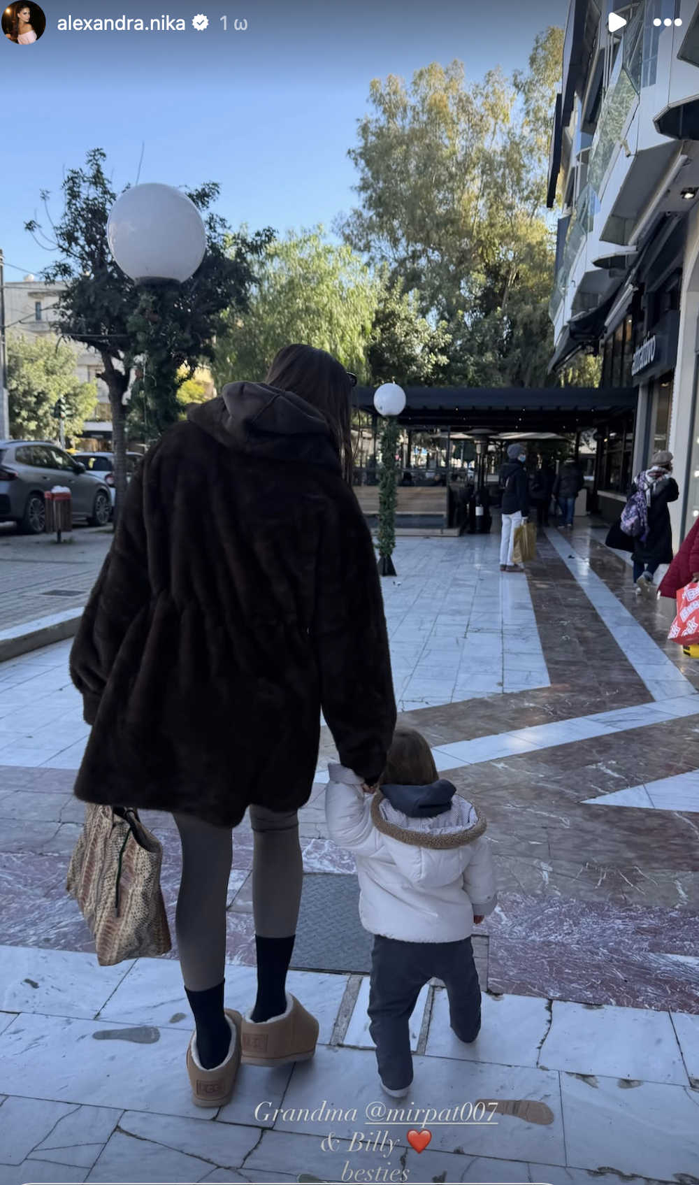 Μια φωτογραφία γιαγιάς και εγγονού μοιράστηκε η Αλεξάνδρα Νίκα, ενώ οι τρεις τους ήταν σε χαλαρή βόλτα, σήμερα το μεσημέρι, 8 Ιανουαρίου.