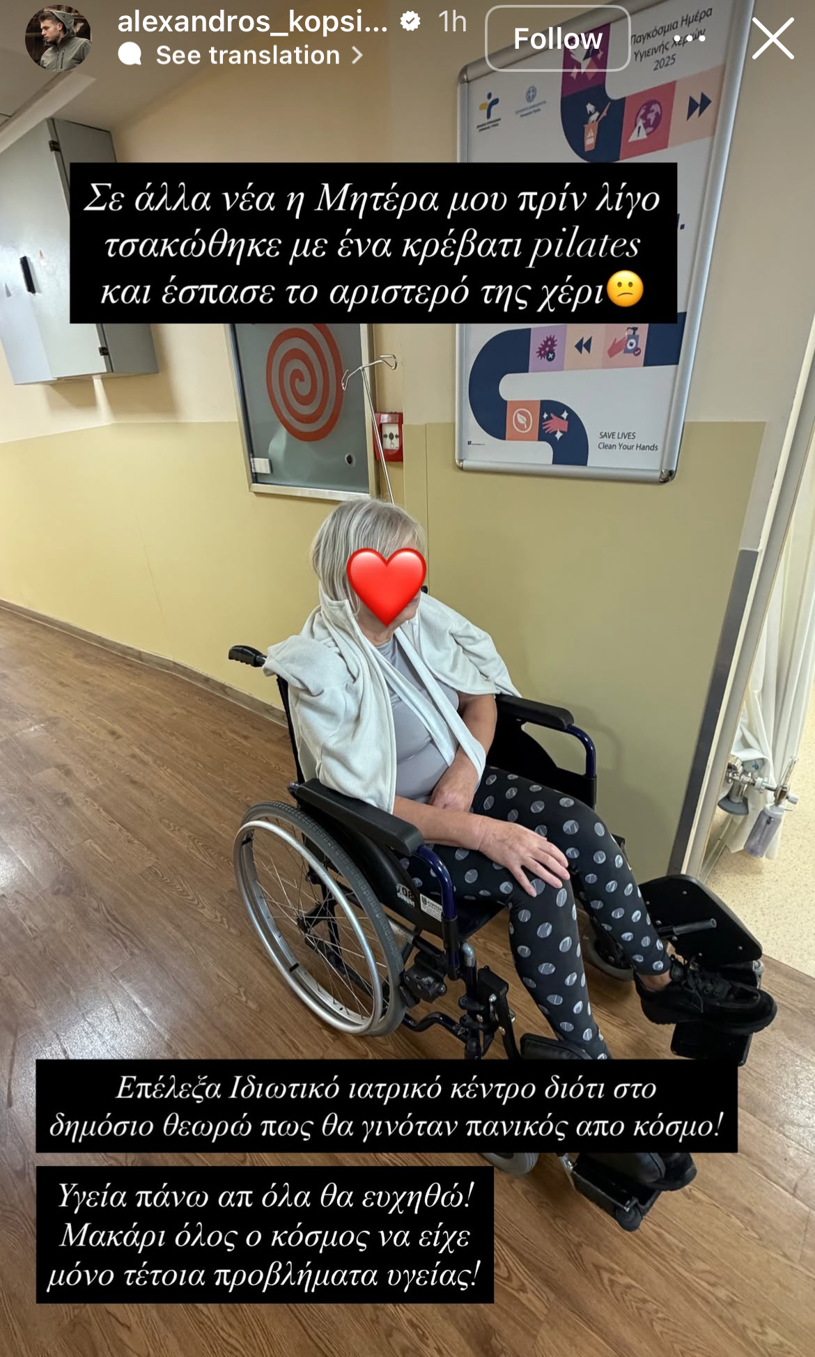 Ο Αλέξανδρος Κοψιάλης συνηθίζει να μοιράζεται με τους ακόλουθούς του στο Instagram όχι μόνο στιγμές γέλιου, αλλά και πιο προσωπικές πτυχές της καθημερινότητάς του. Το απόγευμα της Τετάρτης 26 Νοεμβρίου, αποκάλυψε μέσα από ένα story ότι η μητέρα του μεταφέρθηκε στο νοσοκομείο, ύστερα από ένα ατύχημα την ώρα που γυμναζόταν.