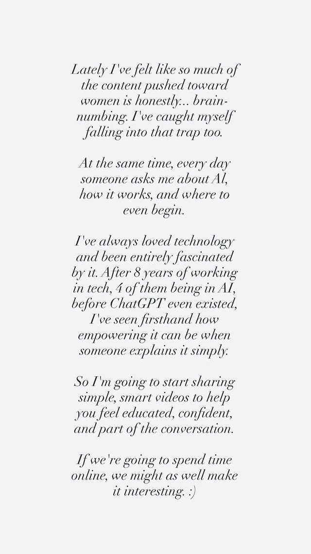 Στα insta stories της εξήγησε πως η ίδια έχει πολυετή εμπειρία στον χώρο της τεχνολογίας, με αρκετά χρόνια να αφοσιώνονται στο AI, πριν καν εμφανιστεί το ChatGPT. Με αφορμή τις πολλές ερωτήσεις που δέχεται καθημερινά για τον κόσμο της τεχνητής νοημοσύνης, θέλησε να μοιραστεί γνώσεις και πρακτικές συμβουλές, ώστε να γίνει πιο προσιτός και κατανοητός σε όλους.