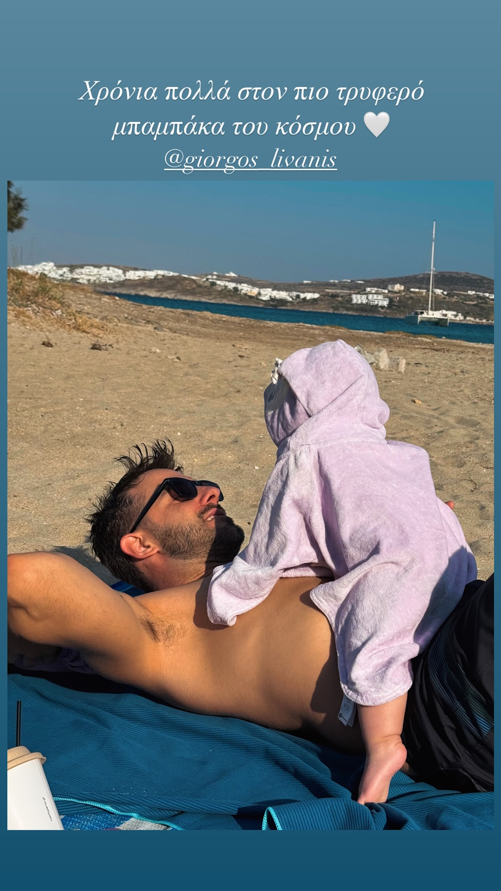 Λίγη ώρα αργότερα, η Ανδρομάχη Δημητροπούλου, ανάρτησε μία δεύτερη αφιέρωση, αυτή τη φορά στον Γιώργο Λιβάνη, ο οποίος φαίνεται ξαπλωμένος σε παραλία, κρατώντας τρυφερά το παιδί τους. Η λεζάντα που συνόδευσε τη φωτογραφία ήταν εξίσου γλυκιά: «Χρόνια πολλά στον πιο τρυφερό μπαμπάκα του κόσμου». Η εικόνα αποπνέει θαλπωρή και οικογενειακή αρμονία, με φόντο το ειδυλλιακό τοπίο του νησιού.