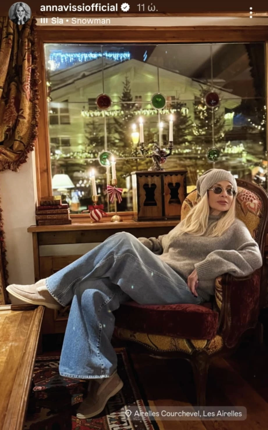 Η Άννα φρόντισε να διατηρήσει και το στιλ της, επιλέγοντας ένα cozy αλλά κομψό outfit: μπεζ πουλόβερ, denim παντελόνι, σκούφος και ασορτί μποτάκια, ιδανικό για χειμερινές εξορμήσεις στις Άλπεις. Οι φωτογραφίες που μοιράστηκε δείχνουν μια Βίσση ήρεμη, στιλάτη και απόλυτα συνδεδεμένη με την οικογενειακή ατμόσφαιρα των γιορτών.