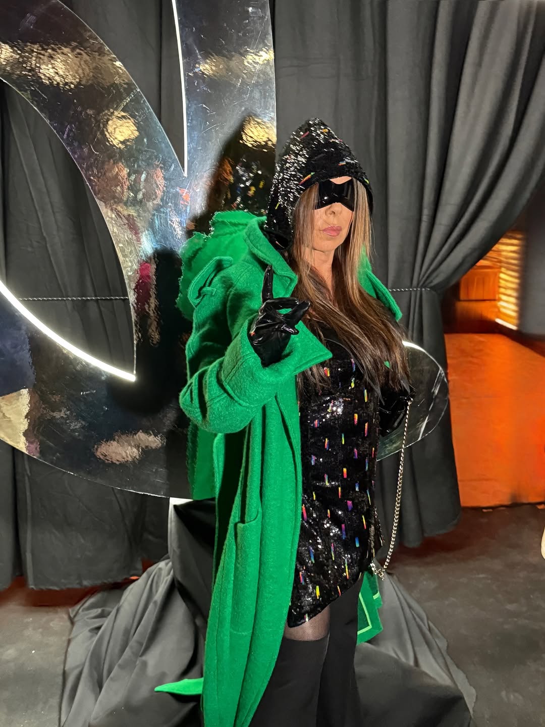 Η Άντζελα Δημητρίου τράβηξε όλα τα βλέμματα μοιράζοντας στους θαυμαστές της στο Instagram στιγμιότυπα από το εντυπωσιακό της outfit. Η τραγουδίστρια φόρεσε ένα μαύρο μίνι φόρεμα με κουκούλα, το οποίο συνδύασε με πράσινες πλατφόρμες και statement μαύρα γυαλιά ηλίου, προσδίδοντας έναν edgy αλλά κομψό χαρακτήρα στο look της.