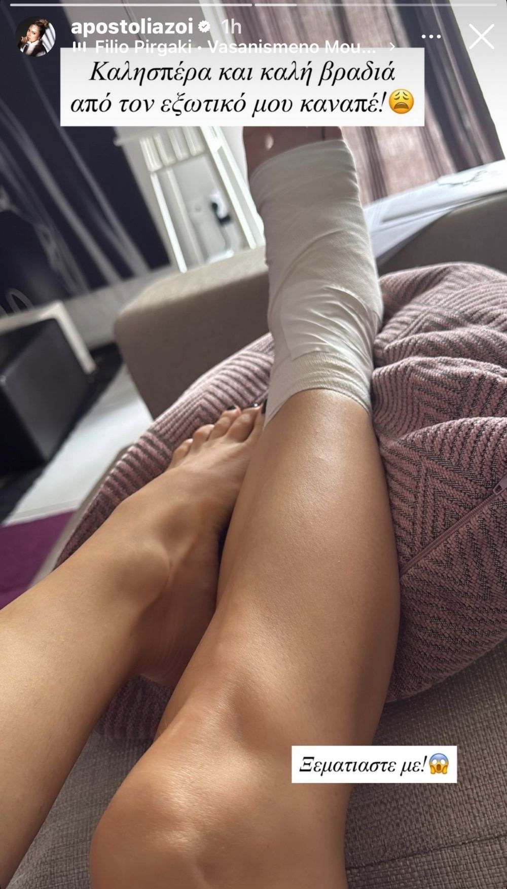 Η τραγουδίστρια δημοσίευσε φωτογραφία από το σπίτι της, στην οποία φαίνεται να ξεκουράζεται στον καναπέ, έχοντας το ένα της πόδι δεμένο. Πάνω στην εικόνα έγραψε: «Καλησπέρα και καλή βραδιά από τον εξωτικό μου καναπέ», ενώ σε δεύτερο σημείο της ανάρτησης πρόσθεσε: «Ξεματιάστε με!».
