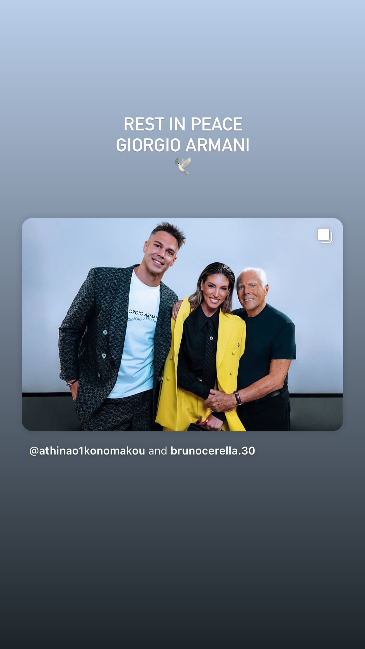 Η γνωστή ηθοποιός και επιχειρηματίας μοιράστηκε δύο στιγμιότυπα στα stories της. Στο πρώτο, ποζάρει χαμογελαστή δίπλα στον Armani και τον αγαπημένος της, Μπρούνο Τσερέλα, γράφοντας: «Rest in peace Giorgio Armani».