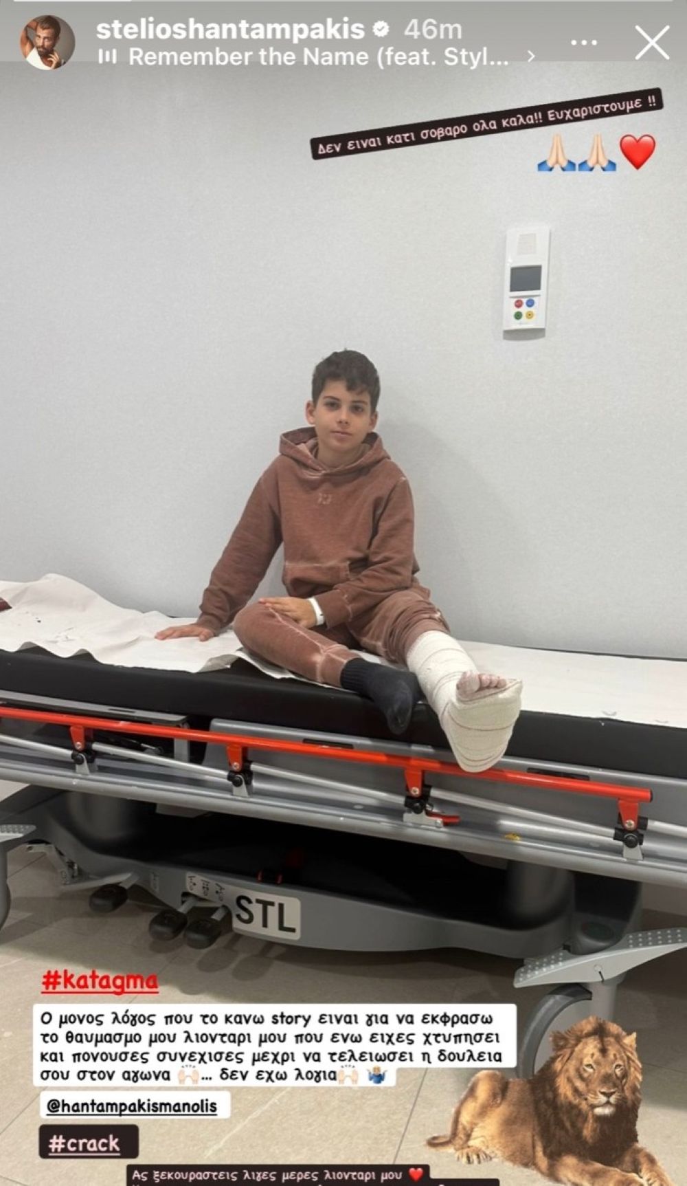 Στο story που δημοσίευσε, ο Στέλιος Χανταμπάκης εμφανίζει τον μικρό Μανώλη σε νοσοκομειακό χώρο, έχοντας το πόδι του δεμένο. Όπως έγραψε χαρακτηριστικά: «Δεν είναι κάτι σοβαρό όλα καλά! Ευχαριστούμε!»