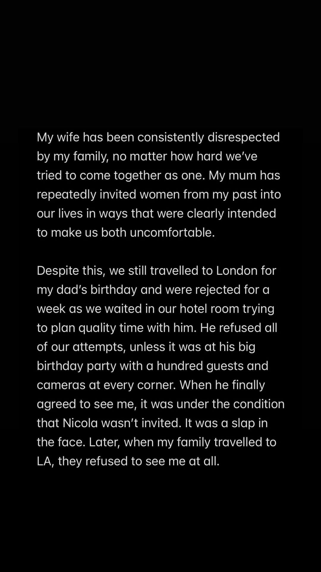 Μέσα από ανάρτησή του στο Instagram, ο 26χρονος υποστήριξε ότι οι γονείς του, Ντέιβιντ και Βικτόρια Μπέκαμ, ελέγχουν εδώ και χρόνια την εικόνα της οικογένειας στον Τύπο, δίνοντας –όπως αναφέρει– προτεραιότητα στο brand έναντι των προσωπικών σχέσεων. Παράλληλα, έκανε λόγο για προσπάθειες υπονόμευσης της σχέσης του με τη σύζυγό του, Νίκολα Πελτζ Μπέκαμ, τόσο πριν όσο και μετά τον γάμο τους.
