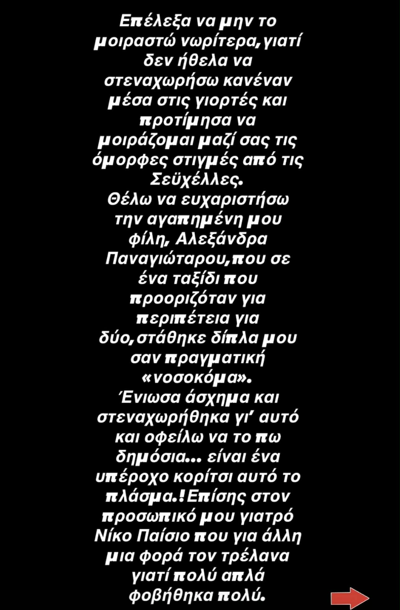 Στο επόμενο story, εξηγεί τον λόγο που δεν ήθελε να το μοιραστεί από τις πρώτες ώρες: «Επέλεξα να μην το μοιραστώ νωρίτερα, γιατί δεν ήθελα να στεναχωρήσω κανέναν μέσα στις γιορτές και προτίμησα να μοιράζομαι μαζί σας τις όμορφες στιγμές από τις Σεϋχέλλες. Θέλω να ευχαριστήσω την αγαπημένη μου φίλη, Αλεξάνδρα Παναγιώταρου, που σε ένα ταξίδι που προοριζόταν για περιπέτεια για δύο, στάθηκε δίπλα μου σαν πραγματική “νοσοκόμα”».