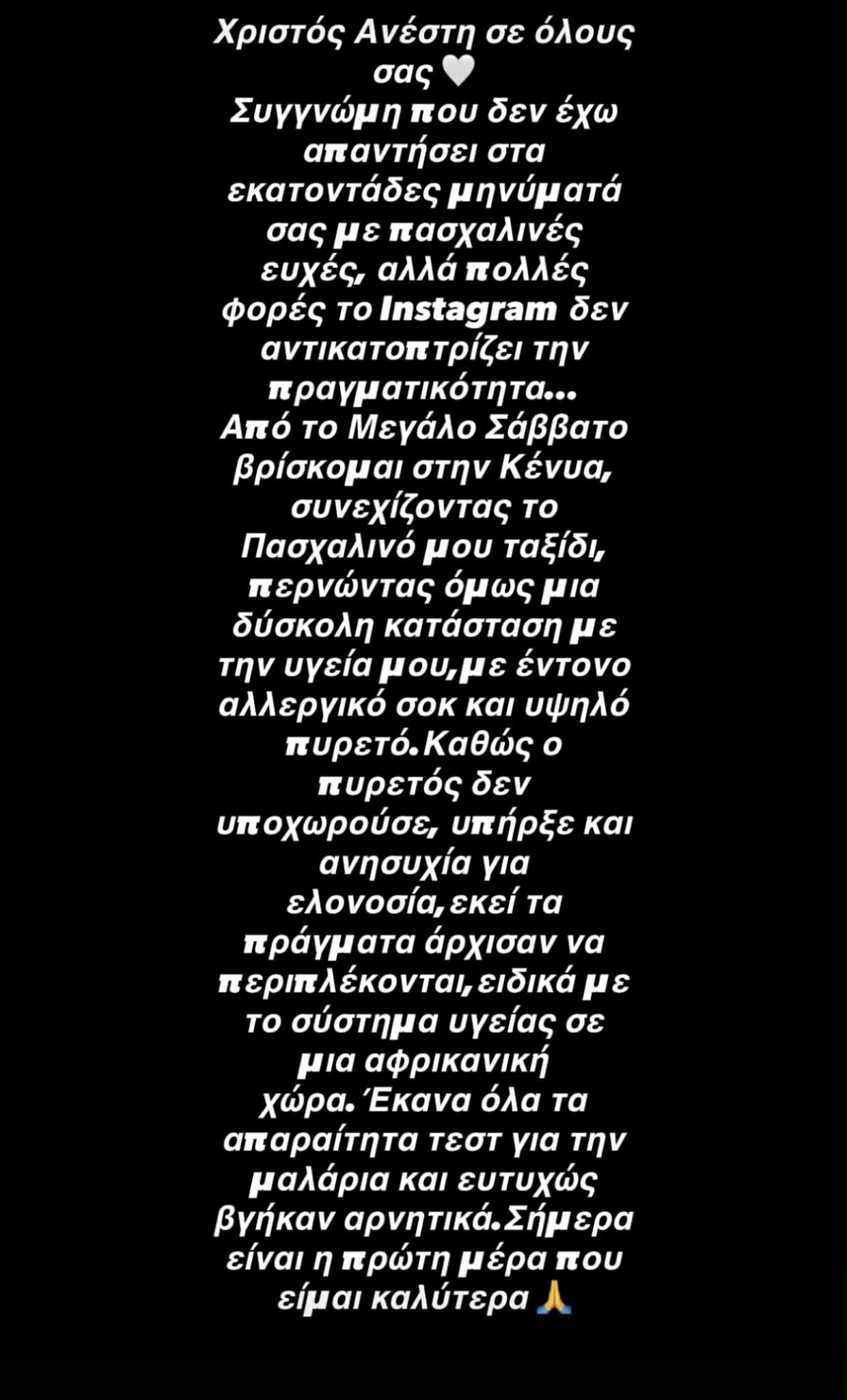 Ο ίδιος μοιράστηκε τις σκέψεις και τα συναισθήματά του, για αυτή τη περιπέτεια που βιώνει, στον προσωπικό του λογαριασμό στο Instagram. Χαρακτηριστικά ανέφερε: «Χριστός Ανέστη σε όλους σας. Συγγνώμη που δεν έχω απαντήσει στα εκατοντάδες μηνύματά σας με πασχαλινές ευχές, αλλά πολλές φορές το Instagram δεν αντικατοπτρίζει την πραγματικότητα… Από το Μεγάλο Σάββατο βρίσκομαι στην Κένυα, συνεχίζοντας το Πασχαλινό μου ταξίδι, περνώντας όμως μια δύσκολη κατάσταση με την υγεία μου, με έντονο αλλεργικό σοκ και υψηλό πυρετό».