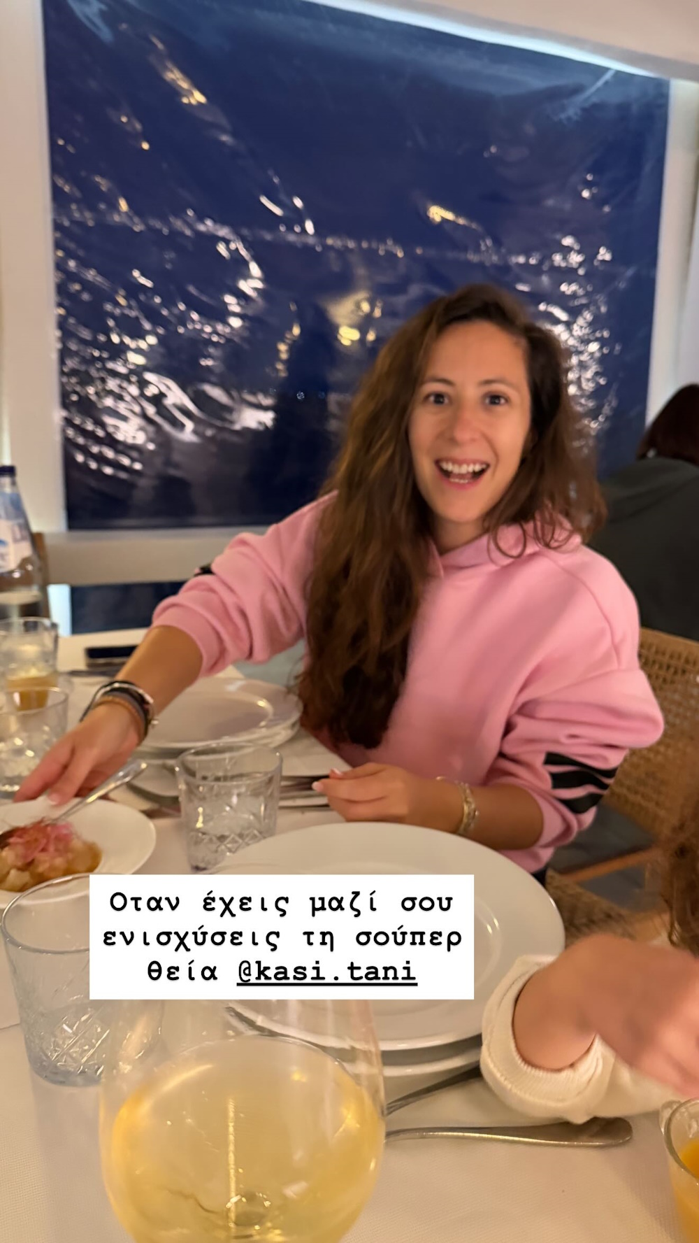 Μαζί τους ένα ακόμη μέλος της οικογένειας Τανιμανίδη, η αδελφή του Σάκη, Κασσιανή την οποία απαθανάτισε η Χριστίνα Μπόμπα κατά την ώρα του γεύματός τους. «Όταν έχεις μαζί σου ενισχύσεις, τη σούπερ θεία», έγραψε η Χριστίνα Μπόμπα στη φωτογραφία της.
