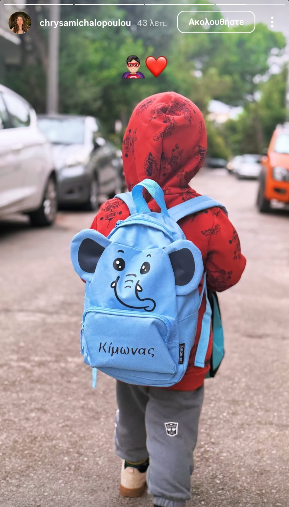Η βροχερή Πέμπτη ξημέρωσε με καλλιτεχνική διάθεση για τη Χρύσα Μιχαλοπούλου και τον μικρό της superhero. Ο Κίμωνας φόρεσε το κόκκινο φούτερ του που τον έκανε να μοιάζει με superhero και πήρε μαζί του το… μικράκι ελεφαντάκι του στην σχολική του τσάντα ξεκινώντας για το σχολείο.