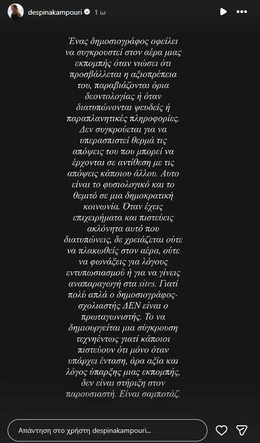 Το να δημιουργείται μια σύγκρουση τεχνηέντως γιατί κάποιοι πιστεύουν ότι μόνο όταν υπάρχει ένταση, άρα αξία και λόγος ύπαρξης μιας εκπομπής, δεν είναι στήριξη στον παρουσιαστή. Είναι σαμποτάζ», έγραψε η δημοσιογράφος, στον προσωπικό της λογαριασμό στο Instagram.