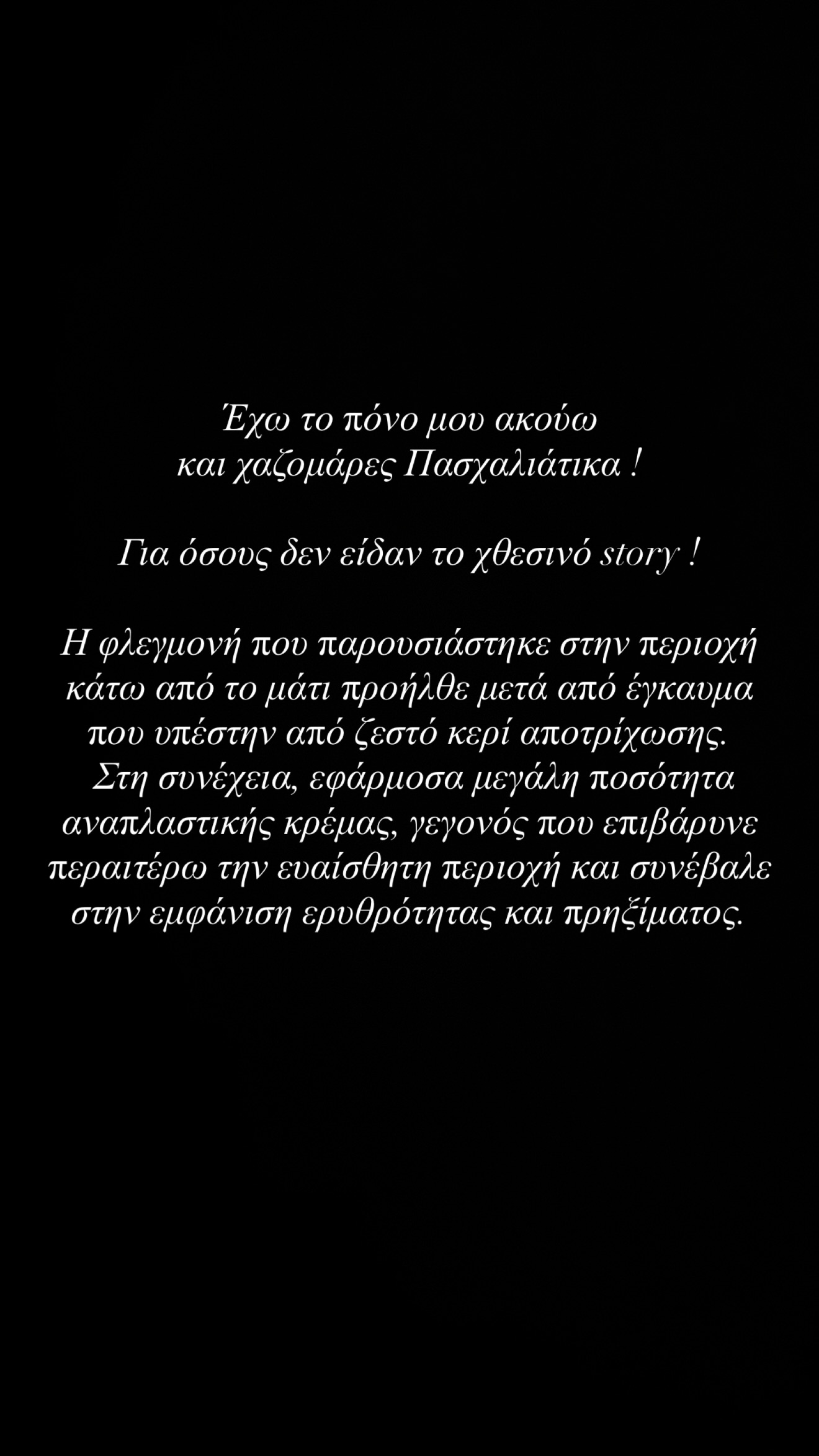 Ωστόσο, μετά τα σχόλια που υπήρξαν στα social media, ήθελε να δώσει περισσότερες λεπτομέρειες για το εν λόγω ζήτημα, γράφοντας σε επόμενο story: «Έχω τον πόνο μου… και ακούω και χαζομάρες πασχαλιάτικα. Για όσους δεν είδαν το χθεσινό story: Η φλεγμονή κάτω από το μάτι προκλήθηκε από έγκαυμα μετά από ζεστό κερί αποτρίχωσης. Στη συνέχεια έβαλα μεγάλη ποσότητα αναπλαστικής κρέμας, που τελικά επιβάρυνε την ήδη ευαίσθητη περιοχή και προκάλεσε έντονη ερυθρότητα και πρήξιμο».