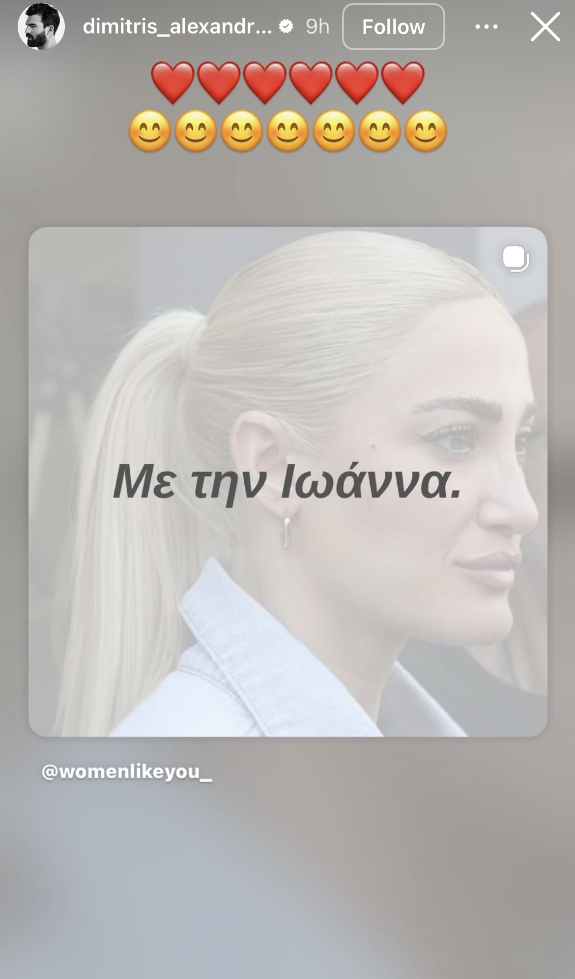 Ο Δημήτρης Αλεξάνδρου προχώρησε σε μια συμβολική κίνηση στήριξης, αναδημοσιεύοντας στα social media μια φωτογραφία με το μήνυμα «Με την Ιωάννα», την οποία συνόδευσε με emoji και κόκκινες καρδιές, εκφράζοντας με αυτόν τον τρόπο τη δημόσια συμπαράστασή του.