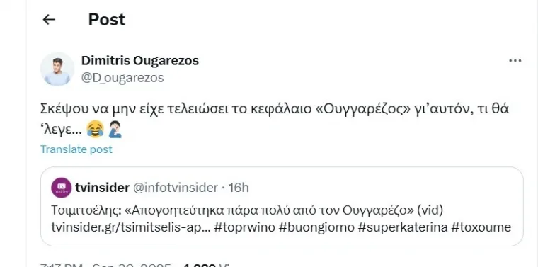 Ο Δημήτρης Ουγγαρέζος δεν άφησε ασχολίαστα τα όσα ειπώθηκαν και μέσω ανάρτησής του στο Χ, έγραψε: «Σκέψου να μην είχε τελειώσει το κεφάλαιο “Ουγγαρέζος” γι’ αυτόν, τι θα ’λεγε…».