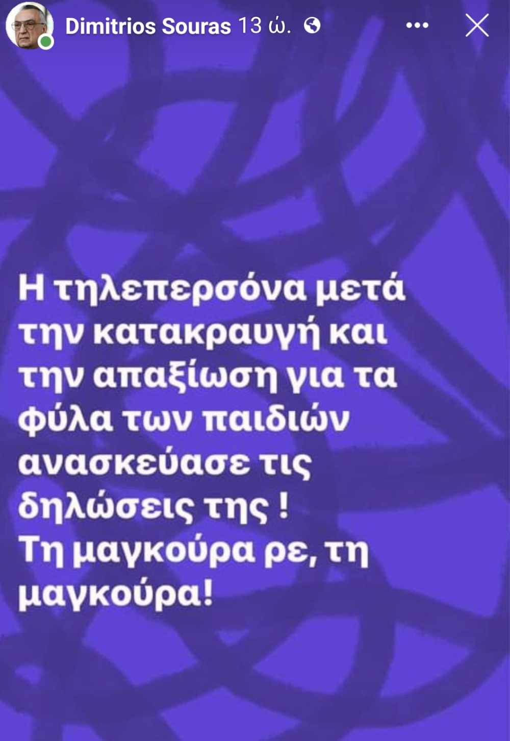 Η διευκρινιστική απάντηση της Μαίρης Συαντσάκη προκάλεσε για μια ακόμη φορά την αντίδραση του γνωστού ψυχιάτρου Δημήτρη Σούρα. Ο ίδιος ανέφερε σε ανάρτησή του στο Facebook.