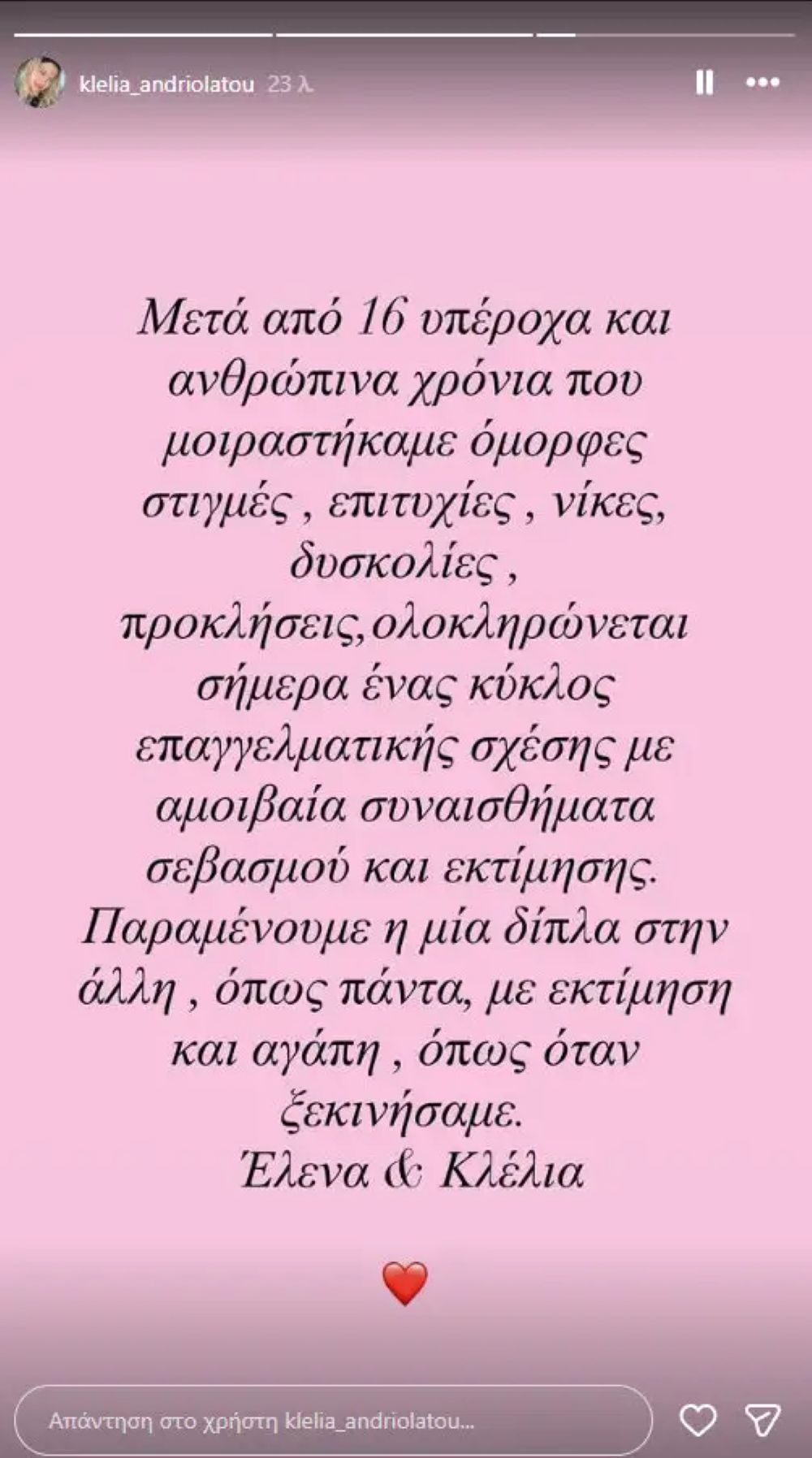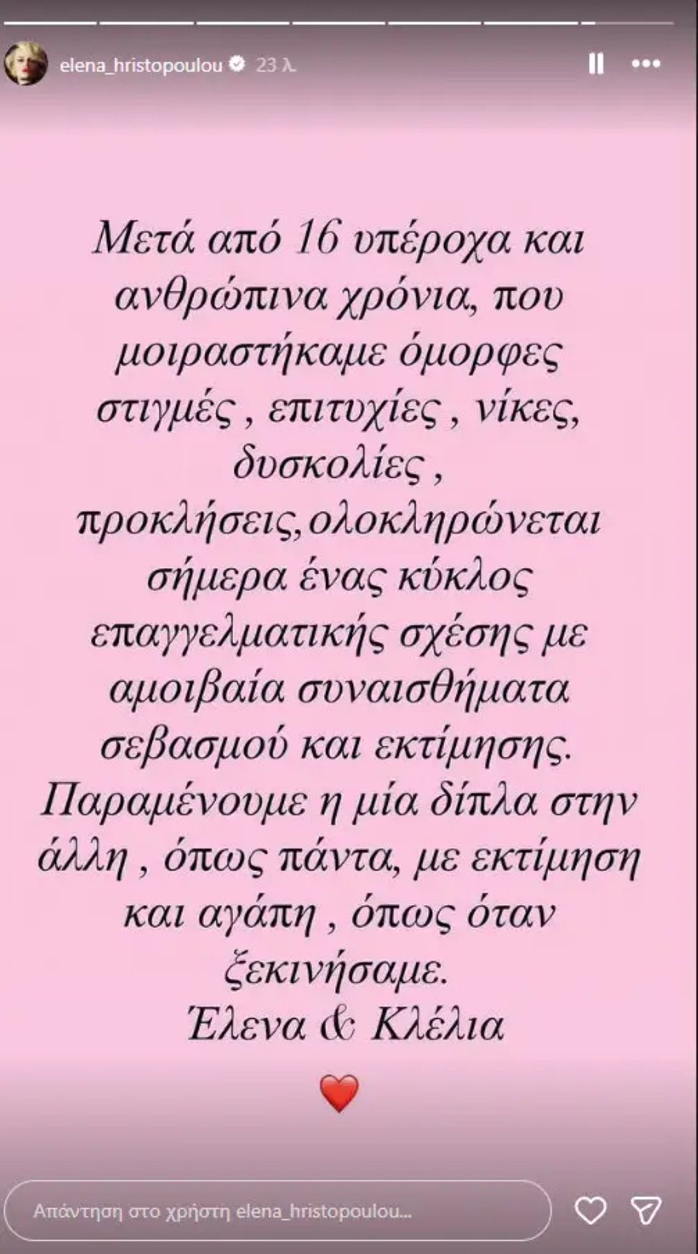 Στην κοινή ανακοίνωσή τους αναφέρουν: «Μετά από 16 υπέροχα και ανθρώπινα χρόνια, που μοιραστήκαμε όμορφες στιγμές, επιτυχίες, νίκες, δυσκολίες, προκλήσεις, ολοκληρώνεται σήμερα ένας κύκλος επαγγελματικής σχέσης με αμοιβαία συναισθήματα σεβασμού και εκτίμησης. Παραμένουμε η μία δίπλα στην άλλη, όπως πάντα, με εκτίμηση και αγάπη, όπως όταν ξεκινήσαμε. Έλενα & Κλέλια».