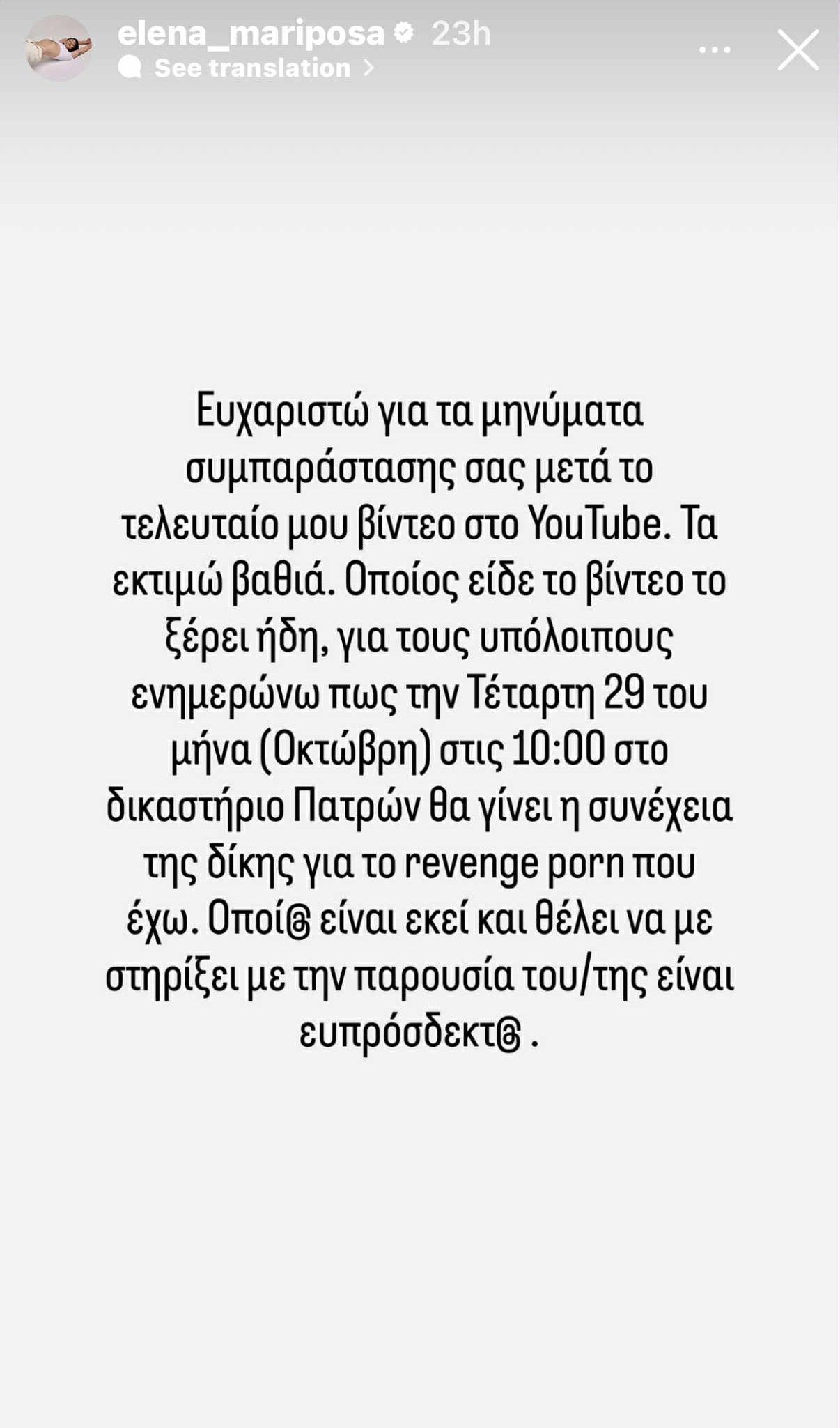 Τα εκτιμώ βαθιά. Όποιος είδε το βίντεο το ξέρει ήδη, για τους υπόλοιπους ενημερώνω πως την Τετάρτη 29 του μήνα (Οκτώβρη) στις 10:00 στο δικαστήριο Πατρών θα γίνει η συνέχεια της δίκης για το revenge porn που έχω. Όποιος είναι εκεί και θέλει να με στηρίξει με την παρουσία του/της είναι ευπρόσδεκτ@».
