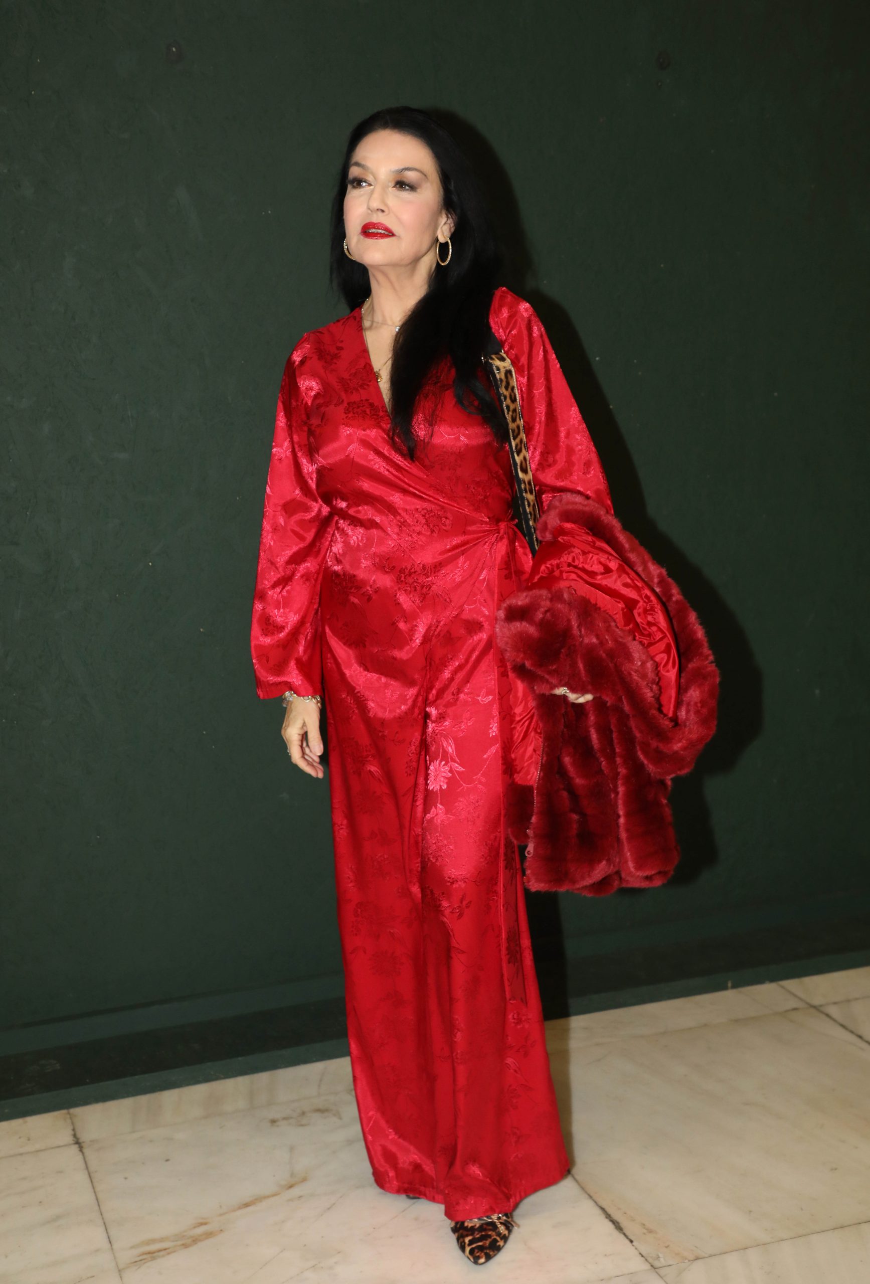 Η ηθοποιός επέλεξε να φορέσει, ένα ιδιαίτερο σατέν κόκκινο φόρεμα, σε wrap γραμμή, το οποίο ανέδειξε την αυτοπεποίθηση και την θηλυκότητά της. Άλλωστε το κόκκινο, όπως γνωρίζουμε είναι ένα χρώμα, που δηλώνει πάθος και δυναμισμό.