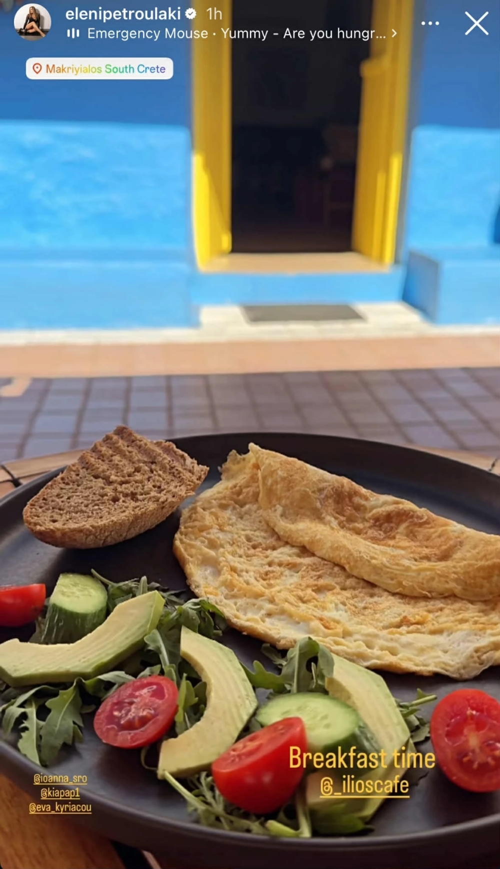 Στο τραπέζι της, ένα πιάτο γεμάτο χρώμα: μια ελαφριά ομελέτα από ασπράδια, δροσερή σαλάτα με ρόκα, αγγουράκι και ντοματίνια και μερικές φέτες αβοκάντο που δίνουν εκείνη την κρεμώδη υφή που ολοκληρώνει το γεύμα. Ένας συνδυασμός που αποδεικνύει πως δεν χρειάζονται περίπλοκες συνταγές για να ξεκινήσει η μέρα ισορροπημένα.