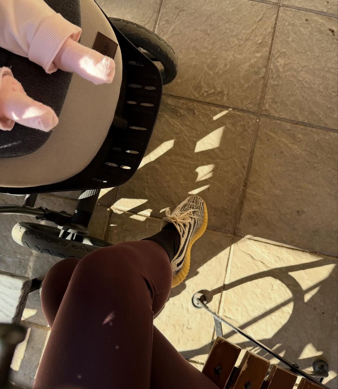 Στη δεύτερη φωτογραφία, ο φακός εστιάζει σε μια πιο «κλεφτή» λεπτομέρεια: τα πόδια της δίπλα στο καρότσι και τα μικροσκοπικά ποδαράκια του μωρού, που ξεπροβάλλουν μέσα από τα ρουχαλάκια του.