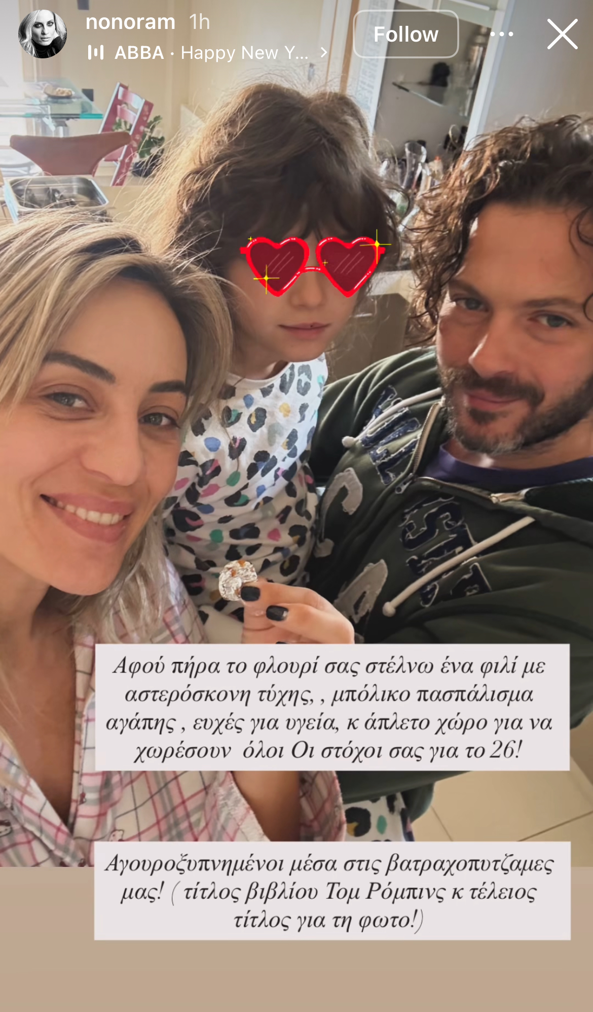 «Αφού πήρα το φλουρί σας στέλνω ένα φιλί με αστερόσκονη τύχης, μπόλικο πασπάλισμα αγάπης, ευχές για υγεία, και άπλετο χώρο για να χωρέσουν όλοι οι στόχοι σας για το 26! Αγουροξυπνημένοι μέσα στις βατραχοπιτζάμες μας! (τίτλος βιβλίου Τομ Ρόμπινς κ τέλειος τίτλος για τη φωτό!)».