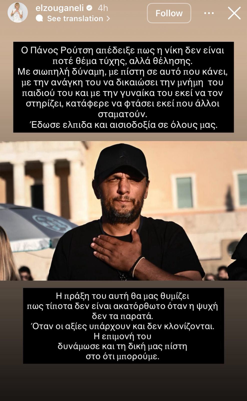 «Ο Πάνος Ρούτσι απέδειξε πως η νίκη δεν είναι ποτέ θέμα τύχης, αλλά θέλησης. Με σιωπηλή δύναμη, με πίστη σε αυτό που κάνει, με την ανάγκη του να δικαιώσει τη μνήμη του παιδιού του και με τη γυναίκα του εκεί να τον στηρίζει, κατάφερε να φτάσει εκεί που άλλοι σταματούν. Έδωσε ελπίδα και αισιοδοξία σε όλους μας. Η πράξη του αυτή θα μας θυμίζει πως τίποτα δεν είναι ακατόρθωτο όταν η ψυχή δεν τα παρατά. Όταν οι αξίες υπάρχουν και δεν κλονίζονται. Η επιμονή του δυνάμωσε και τη δική μας πίστη στο ότι μπορούμε».
