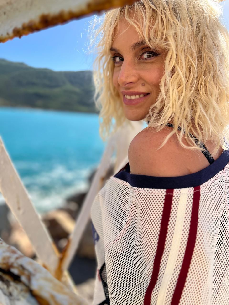 Η τραγουδίστρια ποζάρει σε παραθαλάσσιο σημείο με φόντο το γαλάζιο της θάλασσας και του ουρανού. Φορά τζιν και φαρδιά μπλούζα και χαμογελά στον φακό.