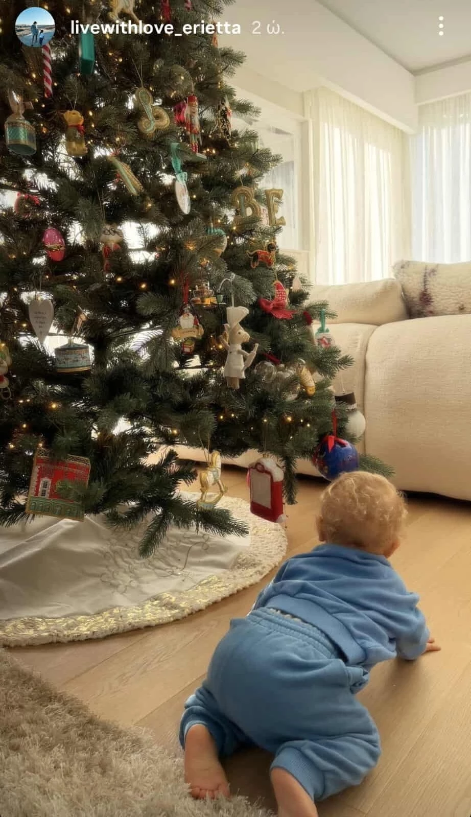 Το χριστουγεννιάτικο δέντρο, στολισμένο με λαμπερά φωτάκια και διακριτικά ornaments, έχει μετατραπεί στο απόλυτο σημείο συνάντησης για όλη την οικογένεια. Ειδικά για τον Λέοντα, που πριν από λίγες ημέρες έκλεισε τον πρώτο χρόνο της ζωής του, το σαλόνι είναι πια ο αγαπημένος του μικρός κόσμος. Μπουσουλά με περιέργεια γύρω από το δέντρο, παρατηρεί τα φώτα που αναβοσβήνουν και χαμογελά κάθε φορά που οι γονείς και ο μεγάλος του αδελφός συμμετέχουν στο παιχνίδι του.