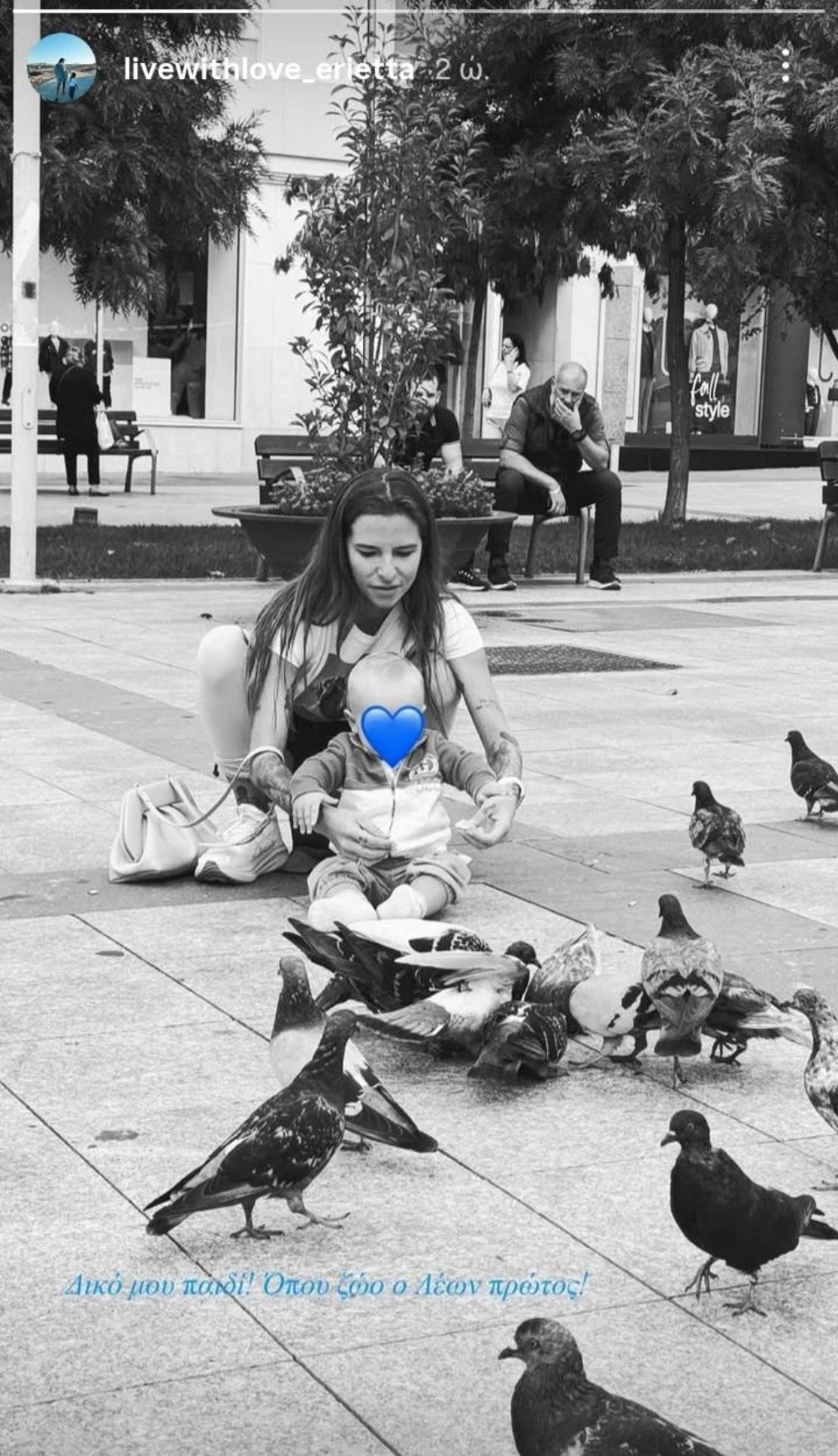 Συγκεκριμένα, δημοσίευσε μια φωτογραφία του μικρού Λέοντα, ο οποίος προσπαθεί να πλησιάσει κάποια περιστέρια στον δρόμο. Στην ανάρτησή της, η Εριέττα σχολίασε χαρακτηριστικά: «Δικό μου παιδί! Όπου ζώο ο Λέων πρώτος!», αναδεικνύοντας την κοινή αγάπη τους για τα ζώα.