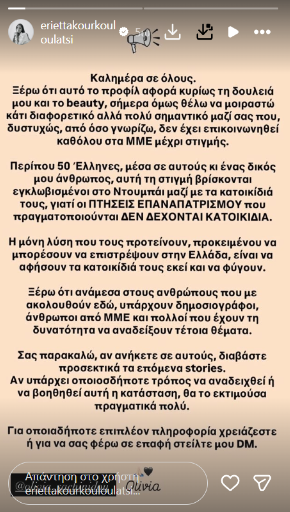 Διαβάστε επίσης: Εριέττα Κούρκουλου Λάτση: Ξέσπασμα για τα σχόλια κατά των Ελλήνων που έχουν αποκλειστεί στο Ντουμπάι