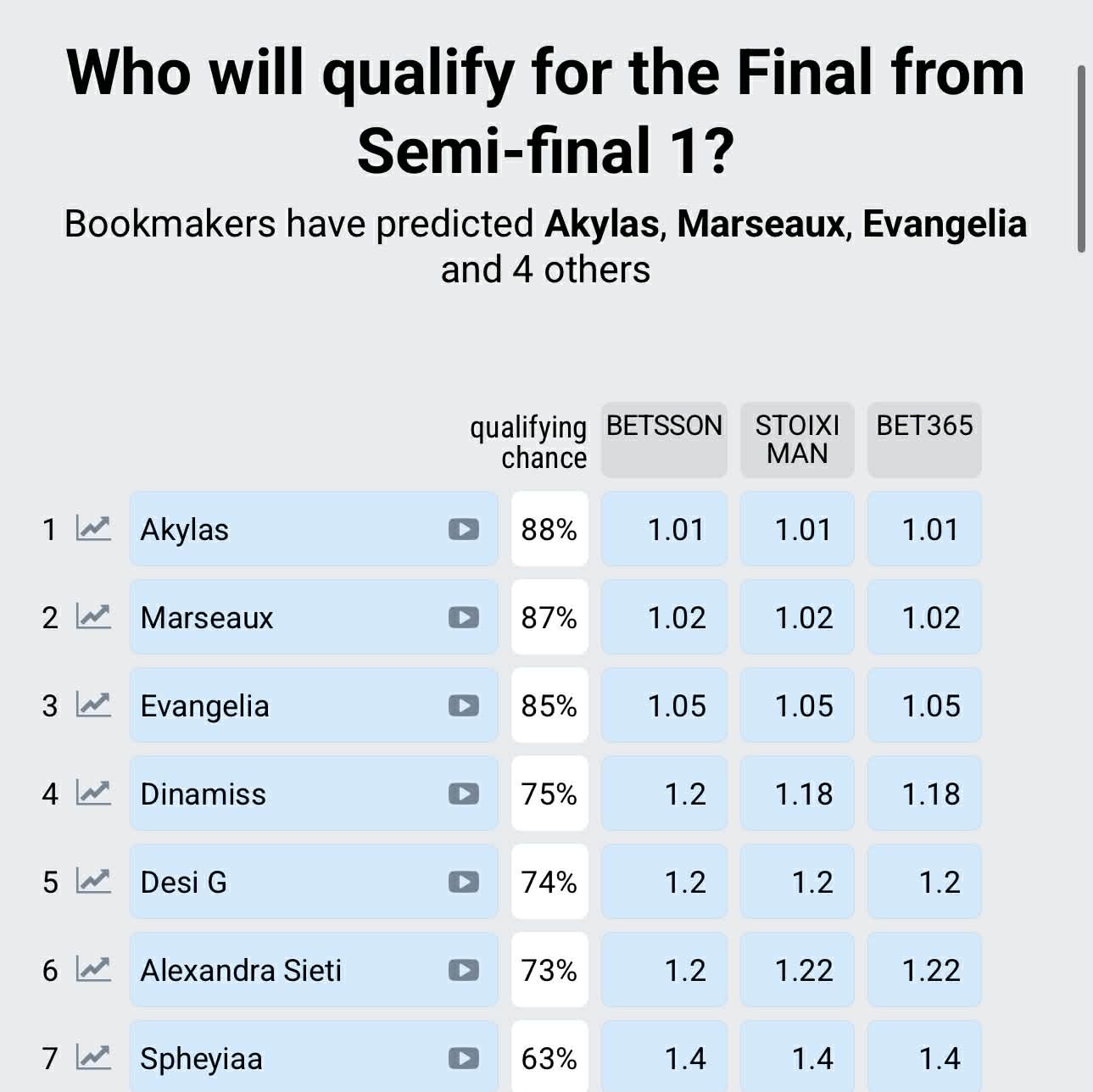 Σύμφωνα, λοιπόν, με τις προβλέψεις, λίγες ώρες πριμ τη μετάδοση του Α’Ημιτελικού, ο Ακύλας συγκεντρώνει 88%, η Μαρσό 87%, η Ευαγγελία με 85% και οι Dinamiss με 75%.