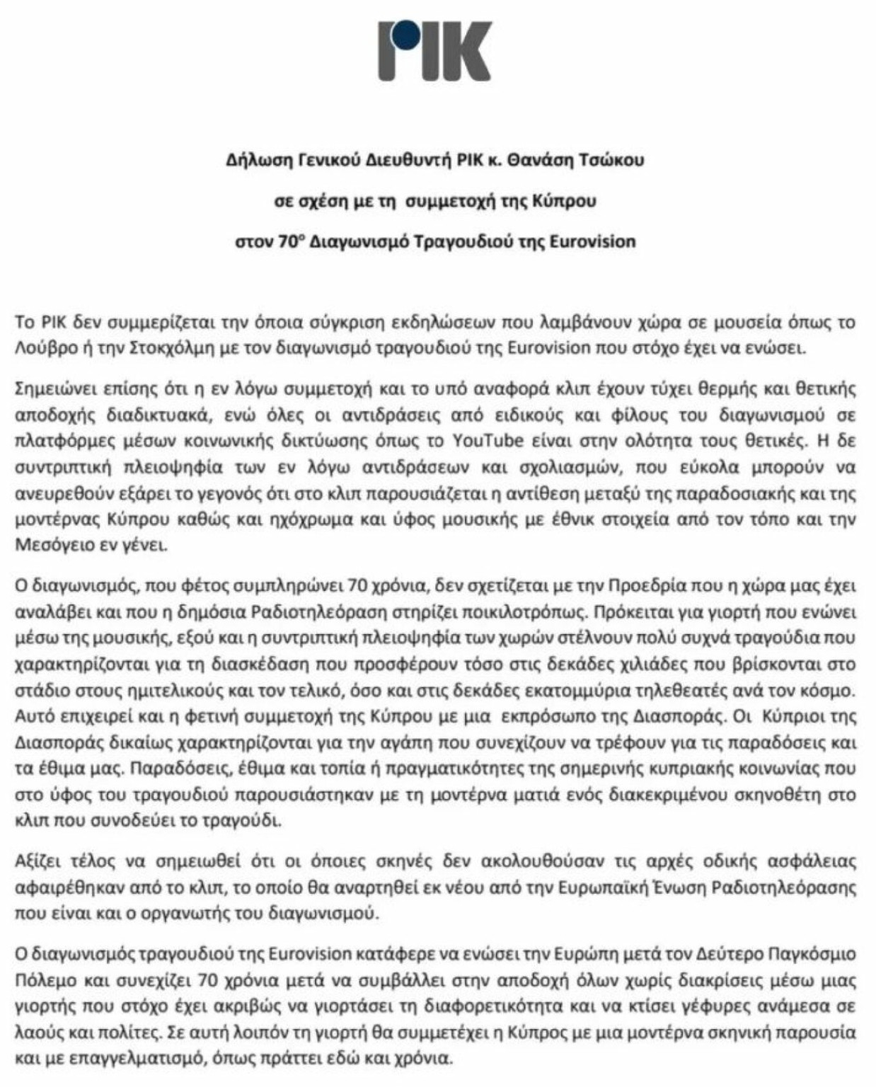 Πρόσωπα από τον χώρο του πολιτισμού, αλλά και από άλλους επαγγελματικούς κλάδους, απέστειλαν επιστολή προς το Ραδιοφωνικό Ίδρυμα Κύπρου (ΡΙΚ), ζητώντας να αποσυρθούν τόσο το τραγούδι όσο και το βίντεο κλιπ.