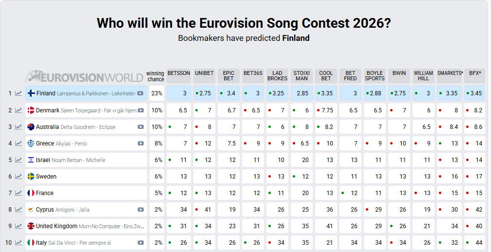 Με 2 μήνες να απομένουν για τη Eurovision 2026 τον Μάιο στη Βιέννη, τα στοιχήματα έχουν ήδη διαμορφώσει μία τάση λίγες ημέρες πριν ολοκληρωθούν και οι τελευταίοι εθνικοί τελικοί των χωρών και έχουμε όλες τις φετινές συμμετοχές. Παρότι βρισκόμαστε ακόμη μακριά από τις πρόβες και τις τελικές σκηνικές παρουσιάσεις, οι πίνακες αποδόσεων και τα διεθνή polls δίνουν μια πρώτη εικόνα για το ποιες χώρες ξεχωρίζουν.