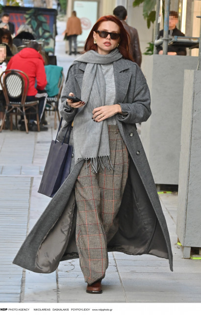 Πιστή στη minimal φιλοσοφία που συχνά επιλέγει, φόρεσε καρό παντελόνι σε διακριτικούς γκρι τόνους και το συνδύασε με ένα κλασικό μάλλινο γκρι παλτό – ένα κομμάτι-κλειδί για κάθε χειμερινή γκαρνταρόμπα. Το look ολοκληρώθηκε με ένα εντυπωσιακό γκρι κασκόλ, που έδωσε extra cozy διάθεση, ενώ οι καφέ μπότες πρόσθεσαν μια ήπια αντίθεση στο σύνολο.