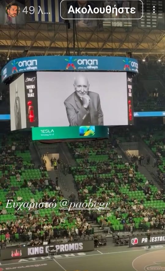Ο Φοίβος Παπαδάκης μοιράστηκε μια φωτογραφία από το στάδιο στα Instagram Stories του, εκφράζοντας την ευγνωμοσύνη του προς τον Παναθηναϊκό για τη σκέψη και την τιμή προς τον πατέρα του, Γιώργο Παπαδάκη.