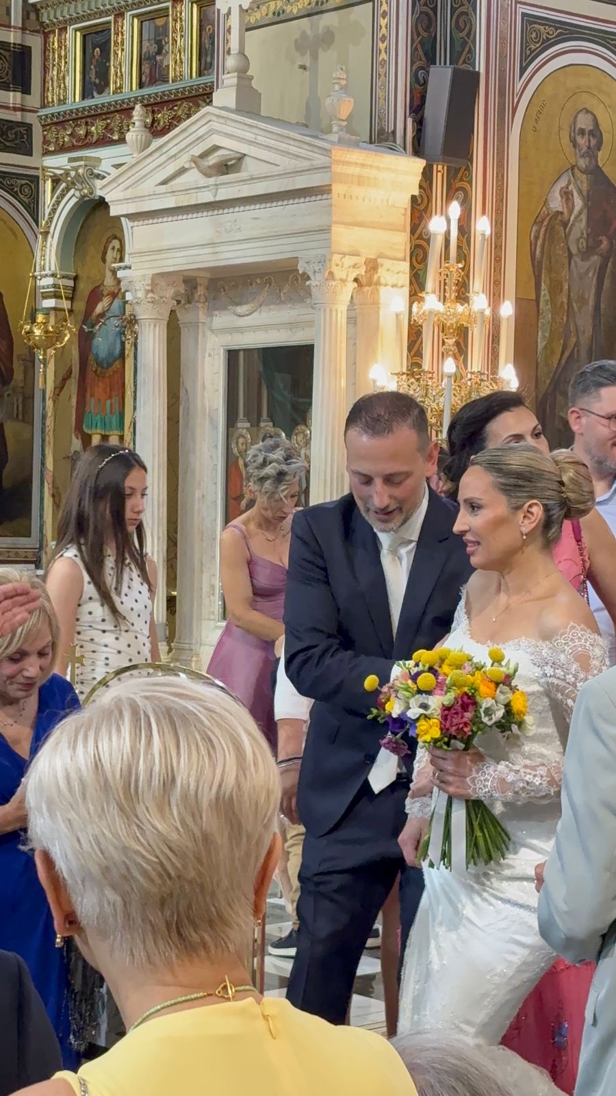 Οι γονείς των νεόνυμφων δεν μπορούσαν να κρύψουν τη συγκίνησή τους καθόλη τη διάρκεια του μυστηρίου αλλά και στην παραδοσιακή «χαιρετούρα» μετά το πέρας της τελετής.