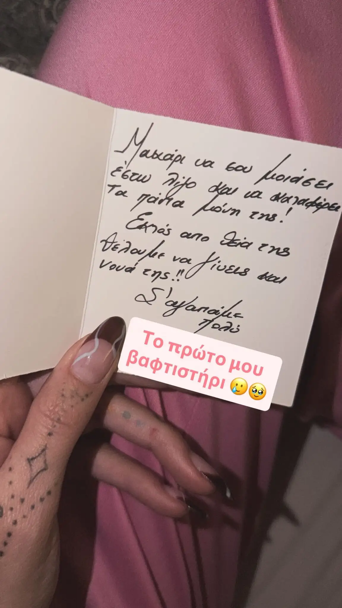 Μάλιστα, η χαρά της έγινε ακόμα μεγαλύτερη όταν της ζητήθηκε να βαφτίσει τη μικρή που έρχεται. Η πρόταση έγινε με τον πιο τρυφερό τρόπο, μέσα από ένα συμβολικό δώρο: μια κούπα που έγραφε «Νονά, σε αγαπώ» και μια κάρτα με το συγκινητικό μήνυμα: «Μακάρι να σου μοιάσει έστω και λίγο, και να καταφέρει τα πάντα μόνη της! Εκτός από θεία της, θέλουμε να γίνεις και νονά της. Σε αγαπάμε πολύ!».