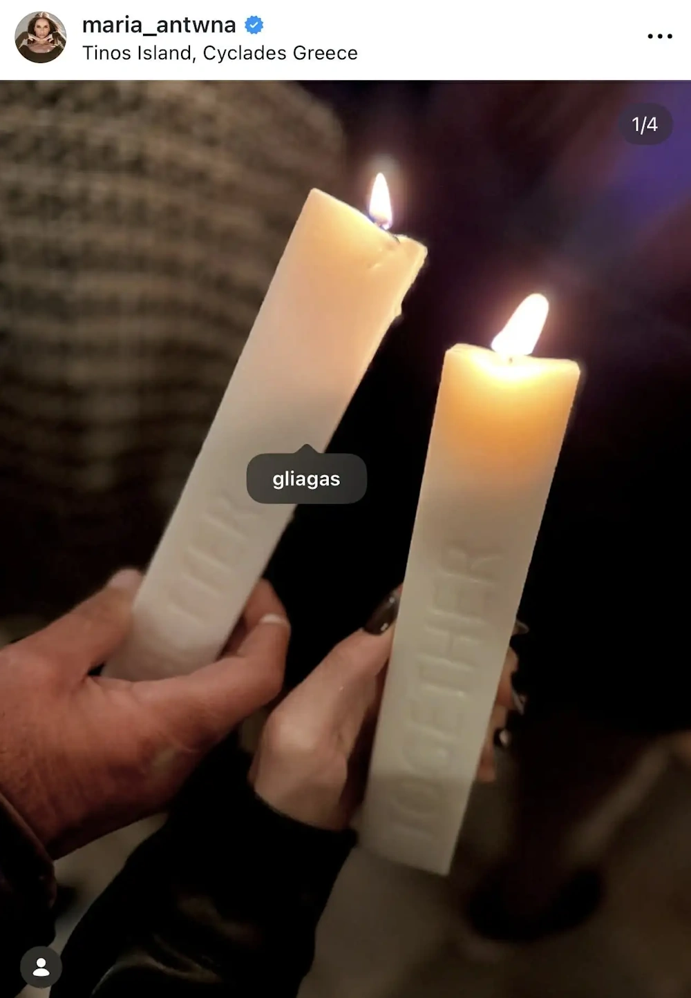 Μάλιστα η Μαρία, έκανε μια ανάρτηση, δείχνοντας τις λαμπάδες τους, οι οποίες γράφουν πάνω «together». Η ραδιοφωνική παραγωγός αρχικά τάγκαρε τον συντροφό της, ενώ αργότερα έσβησε το ταγκ.
