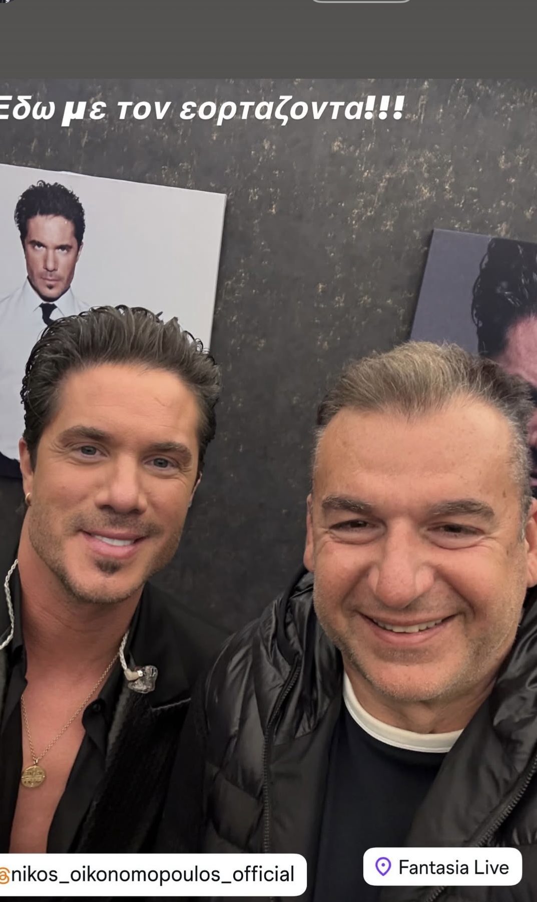 «Εδώ με τον εορτάζοντα», σχολίασε χαρακτηριστικά ο Γιώργος Λιάγκας δίνοντας ευχές στον Νίκο Οικονομόπουλο για τη γιορτή του.