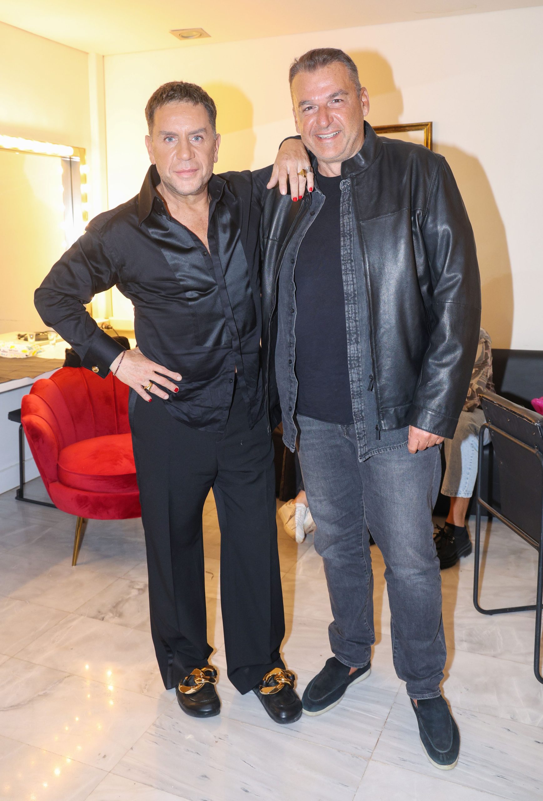 Από την άλλη, ο Γιώργος Λιάγκας εμφανίστηκε με μαύρο δερμάτινο μπουφάν, διατηρώντας κι εκείνος ένα πιο χαλαρό αλλά κομψό ύφος. Η κοινή τους εμφάνιση δεν πέρασε απαρατήρητη, καθώς η παρουσία τους στο πλευρό του Γιώργου Μαζωνάκη και του Φοίβου Δεληβοριά έδωσε μια ξεχωριστή νότα στη βραδιά.
