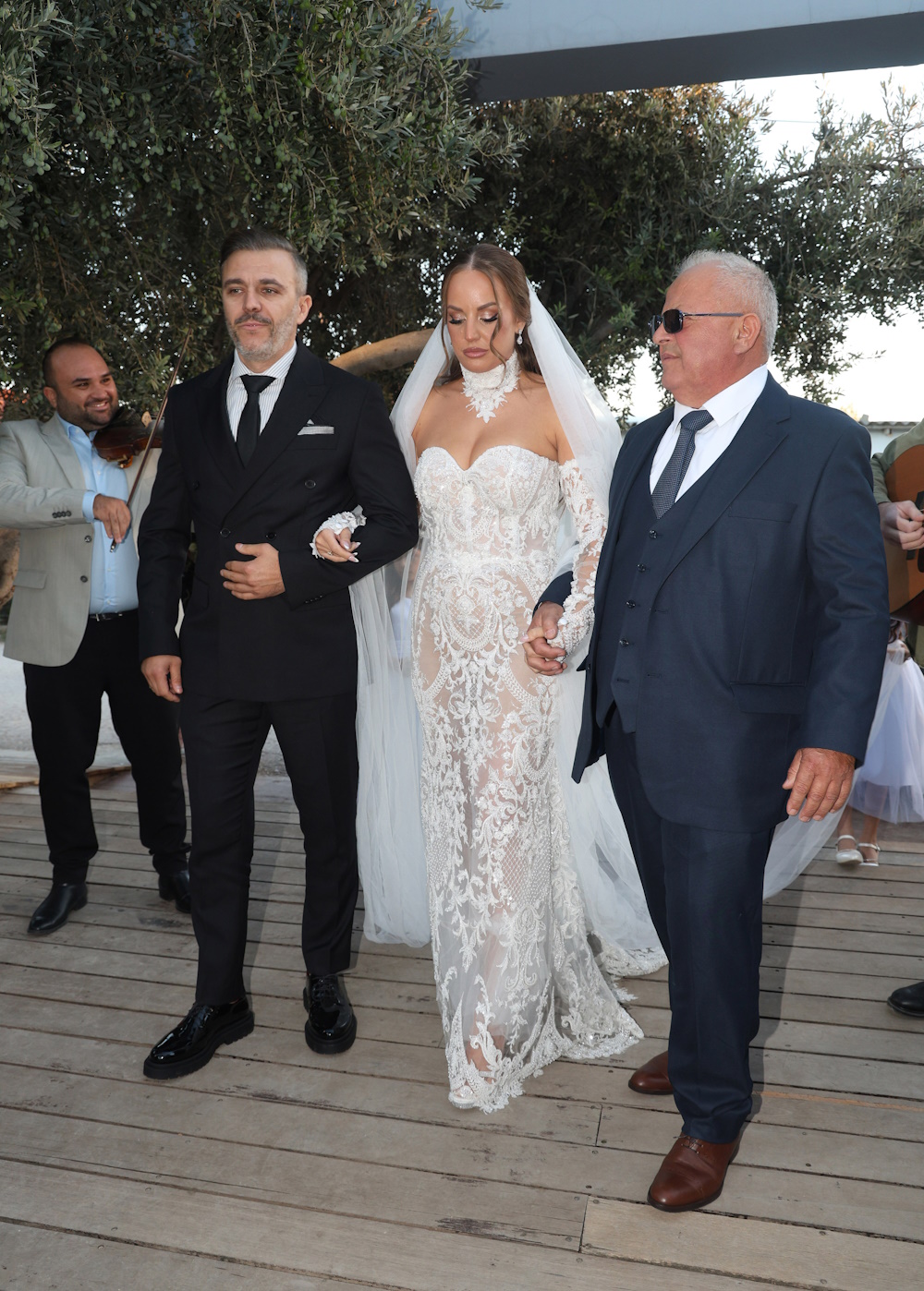 Χαμογελώντας διάπλατα, η Ανδρομάχη Δημητροπούλου έλαμπε μέσα στο δαντελένιο νυφικό στράπλες νυφικό της με το ιδιαίτερο τσόκερ. Στην εκκλησία έφτασε συνοδεία μουσικών οργάνων.