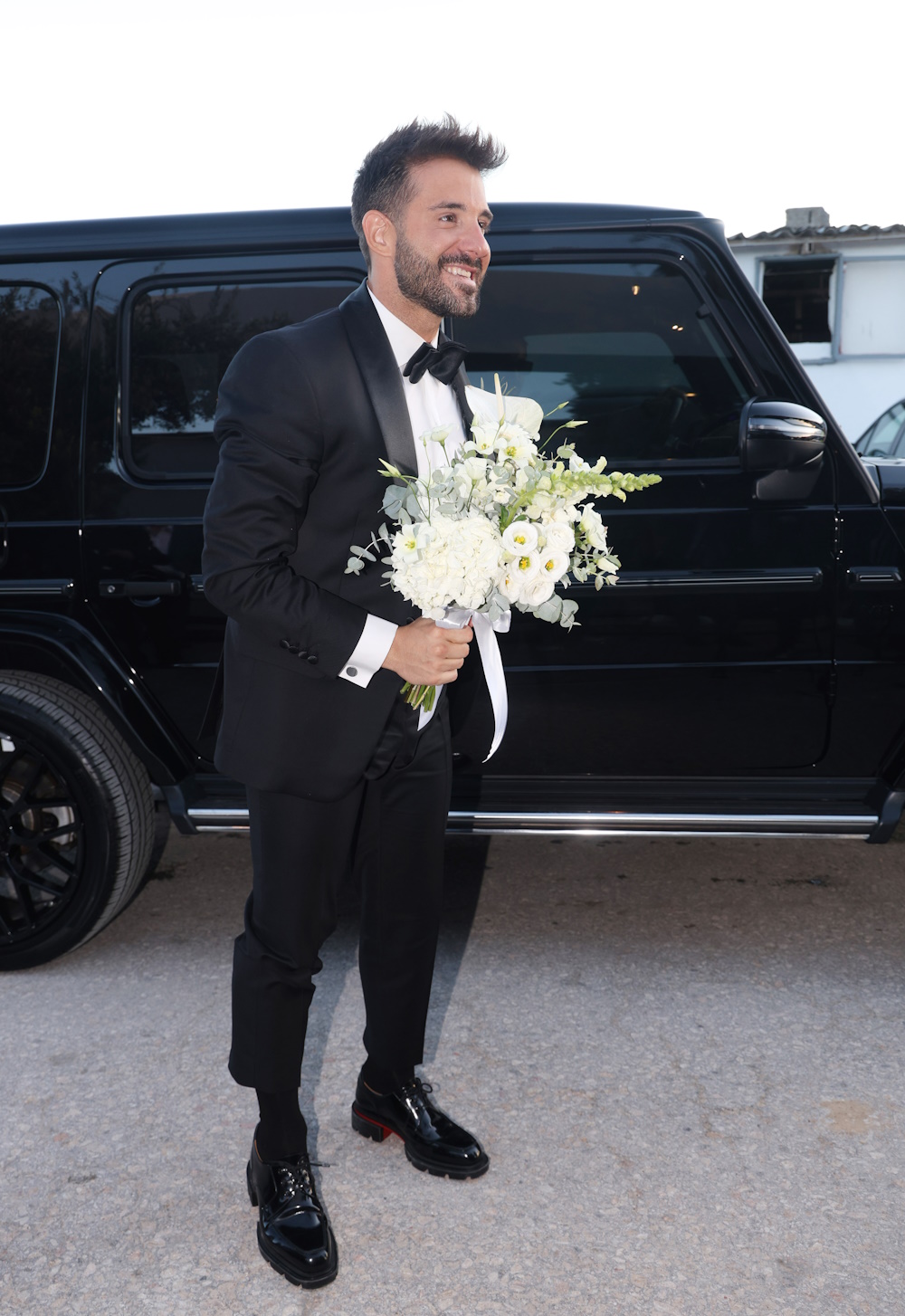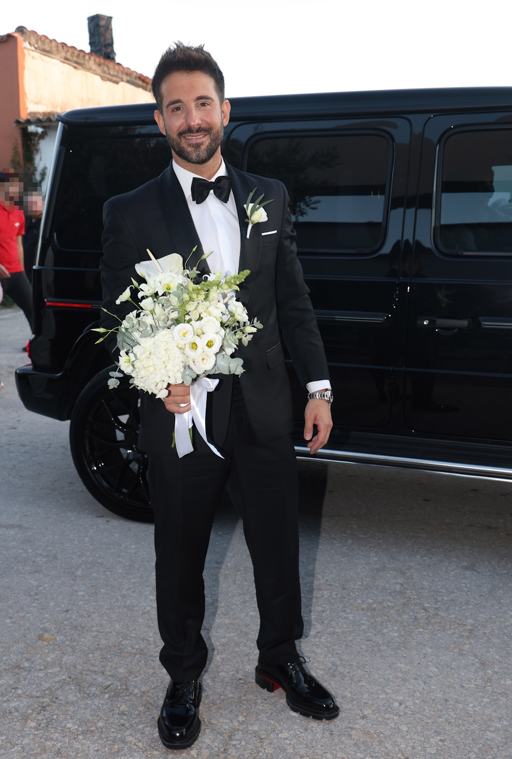 Ο Γιώργος Λιβάνης ντυμένος με μαύρο κοστούμι και παπιγιόν έφτασε στην εκκλησία κρατώντας την ολόλευκη ανθοδέσμη για την αγαπημένη του κι φορώντας ένα κρίνο στο πέτο.