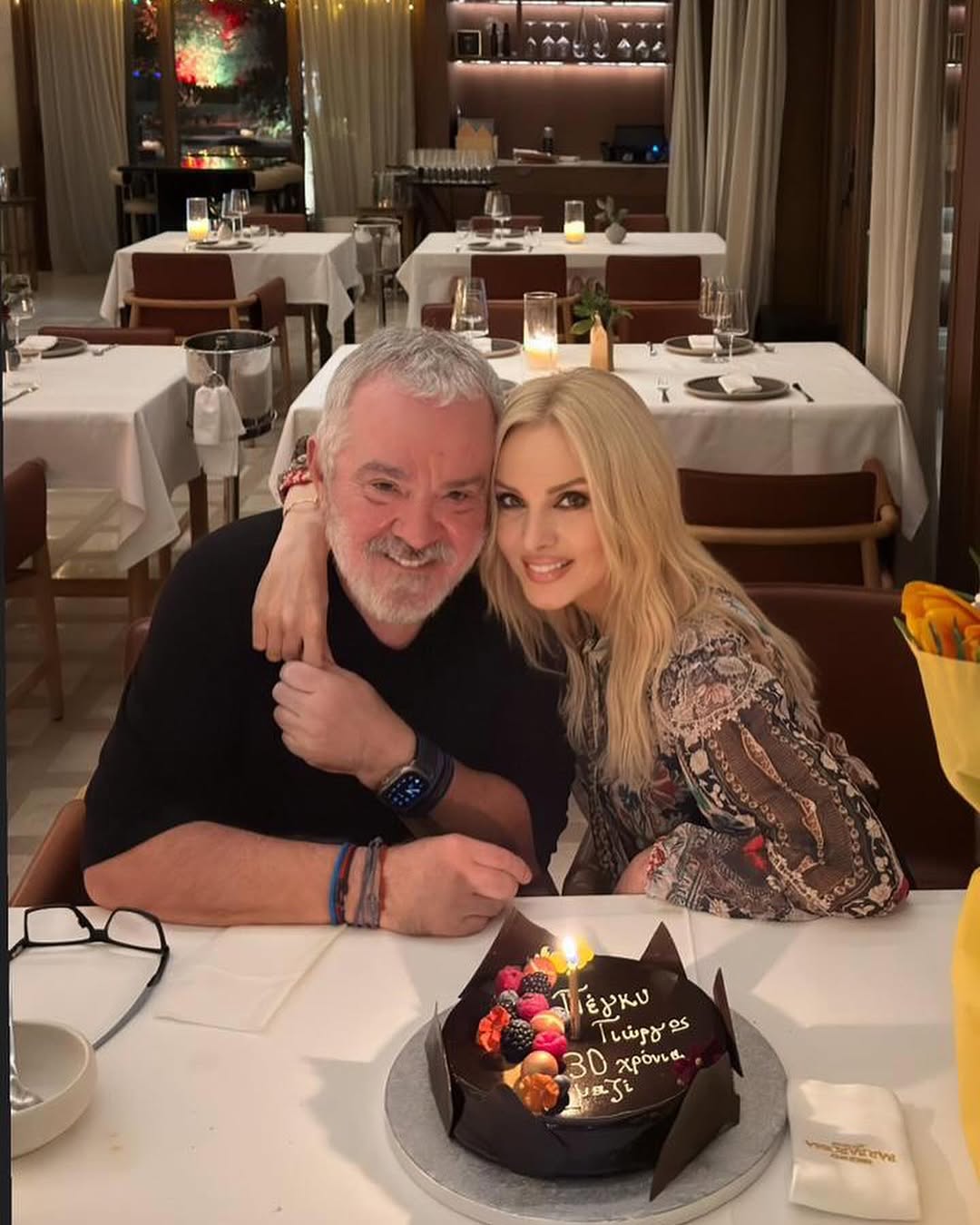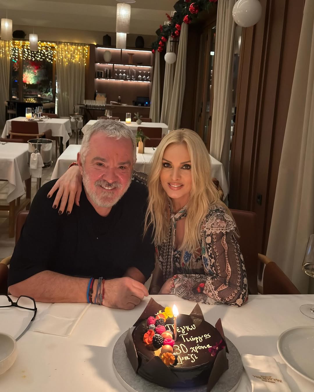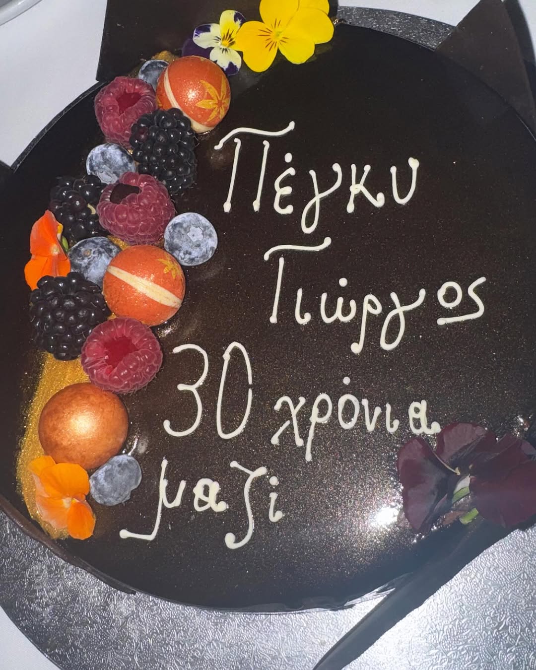 Στα στιγμιότυπα, οι δυο τους ποζάρουν χαμογελαστοί και αγκαλιασμένοι, ενώ στο γλυκό είχε γραφτεί: «Πέγκυ, Γιώργος, 30 χρόνια μαζί», υπογραμμίζοντας το ορόσημο της σχέσης τους.