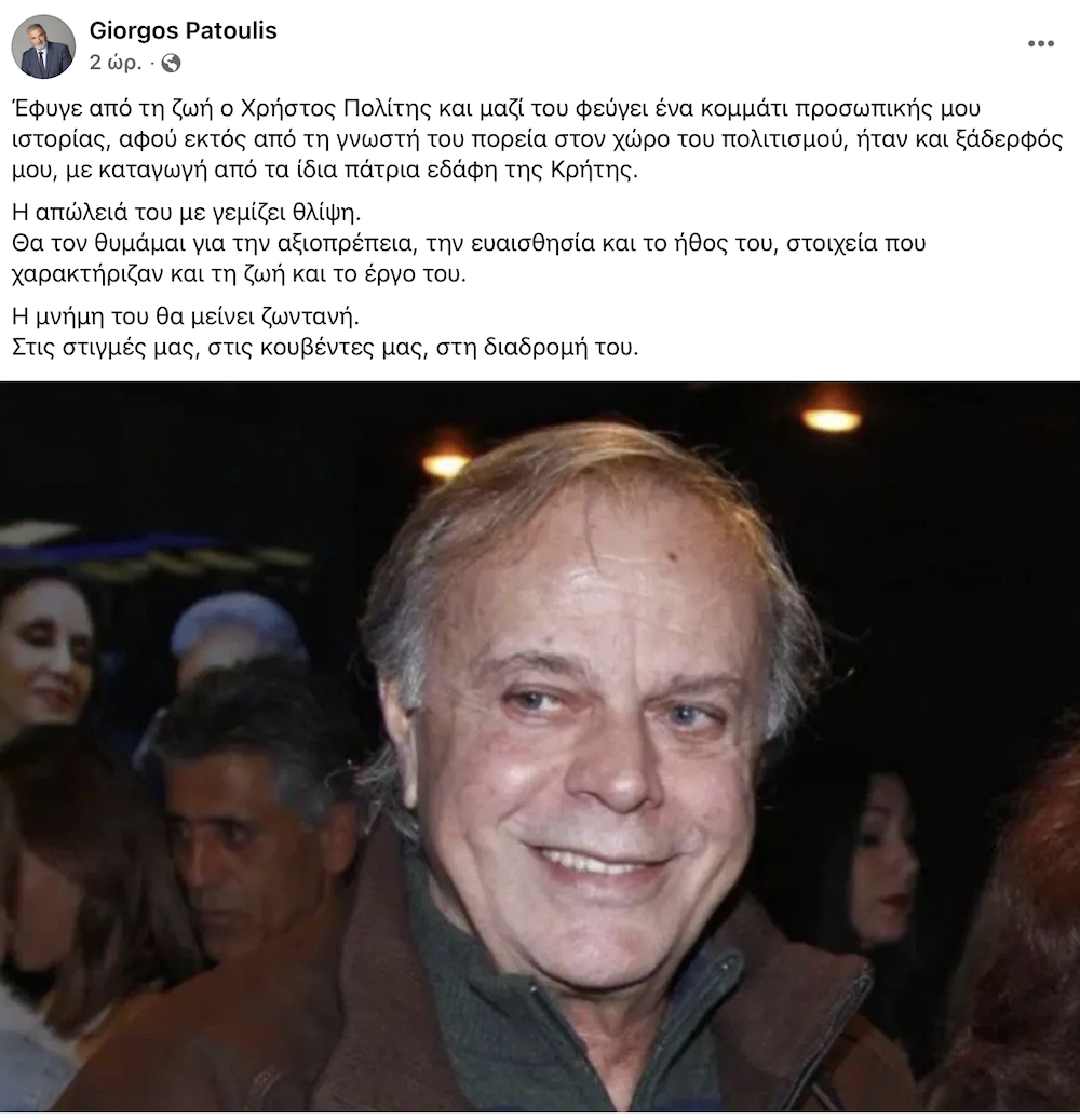Συγκεκριμένα, ο Γιώργος Πατούλης έγραψε: «Έφυγε από τη ζωή ο Χρήστος Πολίτης και μαζί του φεύγει ένα κομμάτι προσωπικής μου ιστορίας, αφού εκτός από τη γνωστή του πορεία στον χώρο του πολιτισμού, ήταν και ξάδερφός μου, με καταγωγή από τα ίδια πάτρια εδάφη της Κρήτης.