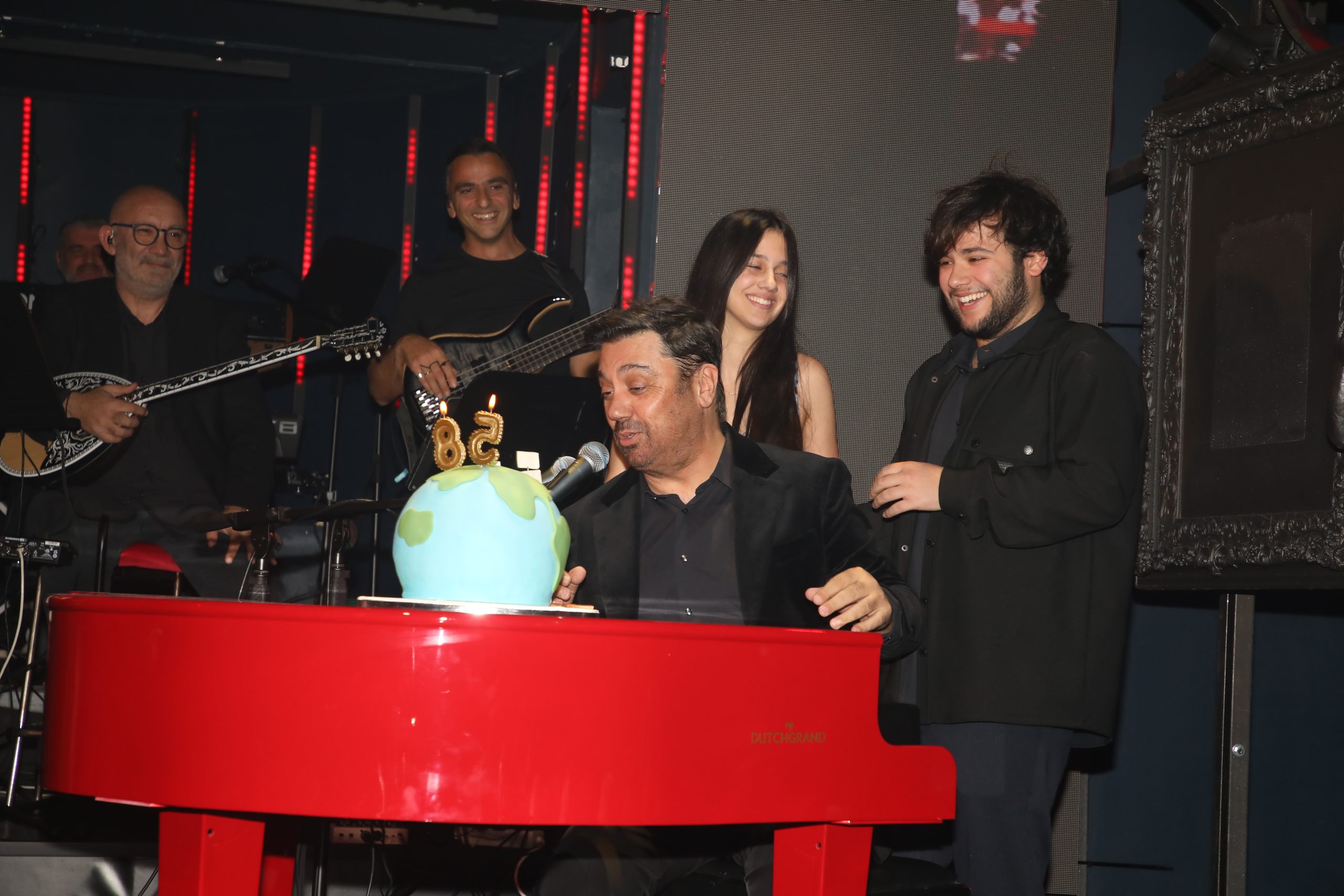 Ιδιαίτερα συγκινητική στιγμή όμως ήταν, όταν τα παιδιά του, Μάνος και Ειρήνη, εμφανίστηκαν στη σκηνή, και του ευχήθηκαν από κοντά χρόνια πολλά, σβήνοντας την τούρτα, που είχε πάνω τα κεράκια με την ηλικία του: 58!